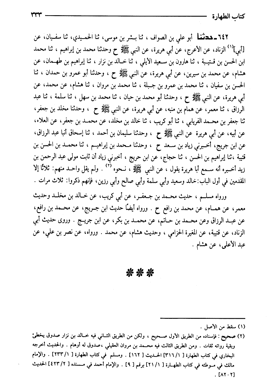 642 - حَدَّثَنَا أَبُو عَلِيِّ بْنُ الصَّوَّافِ ثَنَا بِشْرُ بْنُ مُوسَى ثَنَا الْحُمَيْدِيُّ ثَنَا سُفْيَانُ عَنْ أَبِي الزِّنَادِ عَنِ الأَعْرَجِ عَنْ أَبِي هُرَيْرَةَ عَنِ النَّبِيِّ صَلَّى اللَّهُ عَلَيْهِ وَسَلَّمَ ح وَحَدَّثَنَا مُحَمَّدُ بن إِبْرَاهِيم ثَنَا مُحَمَّد ابْن الْحَسَنِ بْنِ قُتَيْبَةَ ثَنَا هَارُونُ بْنُ سَعِيدٍ الأَيْلِيُّ ثَنَا خَالِدُ بْنُ نِزَارٍ ثَنَا إِبْرَاهِيمُ بْنُ طَهْمَانَ عَنْ هِشَامٍ عَنْ مُحَمَّدِ بْنِ سِيرِينَ عَنْ أَبِي هُرَيْرَةَ عَنِ النَّبِيِّ صَلَّى اللَّهُ عَلَيْهِ وَسَلَّمَ ح وَحَدَّثَنَا أَبُو عَمْرِو بْنُ حَمْدَانَ ثَنَا الْحَسَنُ بْنُ سُفْيَانَ ثَنَا مُحَمَّدُ بْنُ عَمْرِو بْنِ جَبَلَةَ ثَنَا مُحَمَّدُ بْنُ مَرْوَانَ ثَنَا هِشَامٌ عَنْ مُحَمَّدٍ عَنْ أَبِي هُرَيْرَةَ عَنِ النَّبِيِّ صَلَّى اللَّهُ عَلَيْهِ وَسَلَّمَ ح وَحَدَّثَنَا أَبُو مُحَمَّدِ بْنُ حَيَّانَ ثَنَا مُحَمَّدُ بْنُ سَهْلٍ ثَنَا سَلَمَةُ ثَنَا عَبْدُ الرَّزَّاقِ ثَنَا مَعْمَرٌ عَنْ هَمَّامِ بْنِ مُنَبِّهٍ عَنْ أَبِي هُرَيْرَةَ عَنِ النَّبِيِّ صَلَّى اللَّهُ عَلَيْهِ وَسَلَّمَ ح وَحَدَّثَنَا مَخْلَدُ بْنُ جَعْفَرٍ ثَنَا جَعْفَرُ بْنُ مُحَمَّدٍ الْفِرْيَابِيُّ ثَنَا أَبُو كُرَيْبٍ ثَنَا خَالِدُ بْنُ مَخْلَدٍ عَنْ مُحَمَّدِ بْنِ جَعْفَرٍ عَنِ الْعَلاءِ عَنْ أَبِيهِ عَنْ أَبِي هُرَيْرَةَ عَنِ النَّبِيِّ صَلَّى اللَّهُ عَلَيْهِ وَسَلَّمَ ح وَحَدَّثَنَا سُلَيْمَانُ بْنُ أَحْمَدَ ثَنَا إِسْحَاقُ أَنْبَا عَبْدُ الرَّزَّاقِ عَنِ ابْنِ جُرَيْجٍ أَخْبَرَنِي زِيَادُ بْنُ سَعْدٍ ح وَحَدَّثَنَا مُحَمَّدُ بْنُ إِبْرَاهِيمَ ثَنَا مُحَمَّدُ بْنُ الْحَسَنِ بْنِ قُتَيْبَةَ ثَنَا إِبْرَاهِيمُ بْنُ الْحَسَنِ ثَنَا حَجَّاجٌ عَنِ ابْنِ جُرَيْجٍ أَخْبرنِي زِيَاد أَن ثَابت مَوْلَى عَبْدِ الرَّحْمَنِ بْنِ زَيْدٍ أَخْبَرَهُ أَنَّهُ سَمِعَ أَبَا هُرَيْرَةَ يَقُولُ عَنِ النَّبِيِّ صَلَّى اللَّهُ عَلَيْهِ وَسَلَّمَ نَحْوَهُ وَلَمْ يَقُلْ وَاحِدٌ مِنْهُمْ ثَلاثًا إِلا الْمُقَدَّمِينَ فِي أَوَّلِ الْبَابِ خَالِدٍ وَسَعِيدٍ وَأَبِي سَلَمَةَ وَأَبِي صَالِحٍ وَأَبِي رَزِينٍ فَإِنَّهُمْ ذَكَرُوا ثَلاثَ مَرَّاتٍ صَحِيح وفإسناده فِي الطَّرِيق صَحِيح