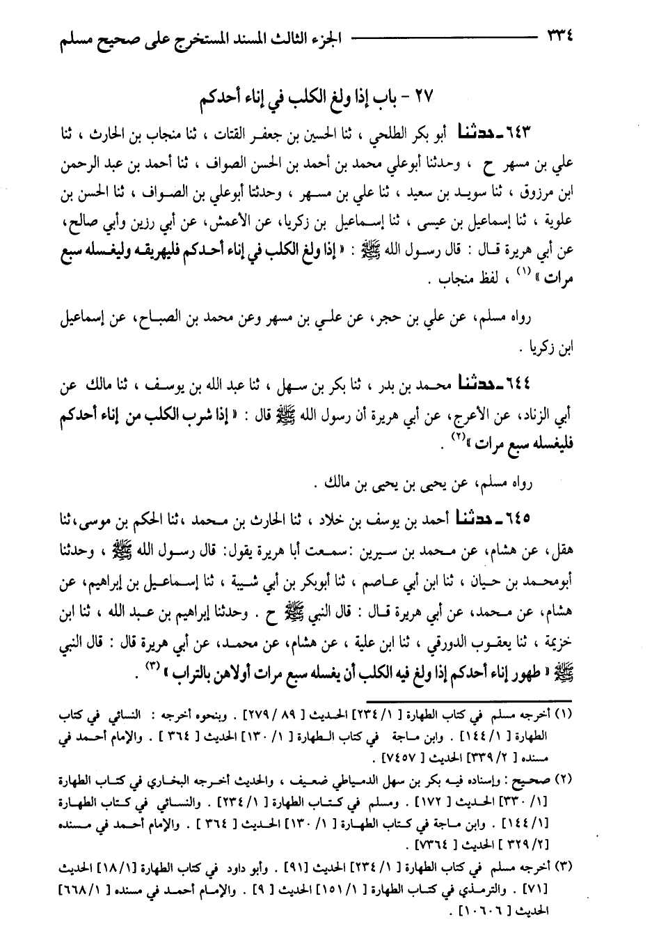 645 - حَدَّثَنَا أَحْمَدُ بْنُ يُوسُفَ بْنِ خَلادٍ ثَنَا الْحَارِثُ بْنُ مُحَمَّدٍ ثَنَا الْحَكَمُ بْنُ مُوسَى ثَنَا هِقْلٌ عَنْ هِشَامٍ عَنْ مُحَمَّدِ بْنِ سِيرِينَ سَمِعْتُ أَبَا هُرَيْرَةَ يَقُولُ قَالَ رَسُول الله وَحَدَّثَنَا أَبُو مُحَمَّدِ بْنُ حَيَّانَ ثَنَا ابْنُ أَبِي عَاصِمٍ ثَنَا أَبُو بَكْرِ بْنُ أَبِي شَيْبَةَ ثَنَا إِسْمَاعِيلُ بْنُ إِبْرَاهِيمَ عَنْ هِشَامٍ عَنْ مُحَمَّدٍ عَنْ أَبِي هُرَيْرَةَ قَالَ قَالَ النَّبِيُّ صَلَّى اللَّهُ عَلَيْهِ وَسَلَّمَ ح وَحَدَّثَنَا إِبْرَاهِيمُ بْنُ عَبْدِ اللَّهِ ثَنَا ابْنُ خُزَيْمَةَ ثَنَا يَعْقُوبُ الدَّوْرَقِيُّ ثَنَا ابْنُ عُلَيَّةَ عَنْ هِشَامٍ عَنْ مُحَمَّدٍ عَنْ أَبِي هُرَيْرَةَ قَالَ قَالَ النَّبِيُّ صَلَّى اللَّهُ عَلَيْهِ وَسَلَّمَ (طُهُورُ إِنَاءِ أَحَدِكُمْ إِذَا وَلَغَ فِيهِ الْكَلْبُ أَنْ يَغْسِلَهُ سَبْعَ مَرَّاتٍ أُولاهُنَّ بِالتُّرَابِ)
