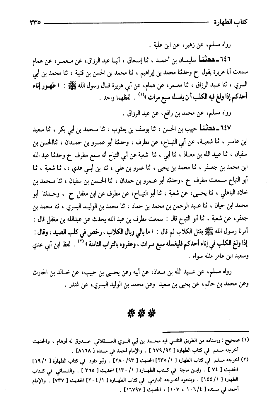647 - حَدَّثَنَا حَبِيبُ بْنُ الْحَسَنِ ثَنَا يُوسُفُ بْنُ يَعْقُوبَ ثَنَا مُحَمَّدُ بْنُ أَبِي بَكْرٍ ثَنَا سَعِيدُ ابْن عَامِرٍ ثَنَا شُعْبَةُ عَنْ أَبِي التَّيَّاحِ عَنْ مُطَرِّفٍ وَحَدَّثَنَا أَبُو عَمْرِو بْنُ حَمْدَانَ ثَنَا الْحَسَنُ بْنُ سُفْيَانَ ثَنَا عُبَيْدُ اللَّهِ بْنُ مُعَاذٍ ثَنَا أَبِي ثَنَا شُعْبَةُ عَنْ أَبِي التَّيَّاحِ أَنَّهُ سمع مُطَرِّفٍ ح وَحَدَّثَنَا عَبْدُ اللَّهِ ابْن مُحَمَّدِ بْنِ جَعْفَرٍ ثَنَا مُحَمَّدُ بْنُ يَحْيَى ثَنَا عَمْرُو بْنُ عَلِيٍّ ثَنَا ابْنُ أَبِي عَدِيٍّ ثَنَا شُعْبَةُ ثَنَا أَبُو التَّيَّاحِ سَمِعت مطرف ح وَحَدَّثَنَا أَبُو عَمْرِو بْنُ حَمْدَانَ ثَنَا الْحَسَنُ بْنُ سُفْيَانَ ثَنَا مُحَمَّدُ بْنُ خَلادٍ الْبَاهِلِيُّ ثَنَا يَحْيَى عَنْ شُعْبَةَ ثَنَا أَبُو التَّيَّاحِ عَنْ مُطَرِّفٍ عَنِ ابْنِ مُغَفَّلٍ ح وَحَدَّثَنَا أَبُو مُحَمَّد ابْن حَيَّانَ ثَنَا عَبْدُ الرَّحْمَنِ بْنُ مُحَمَّدِ بْنِ حَمَّادٍ ثَنَا مُحَمَّدُ بْنُ الْوَلِيدِ الْبُسْرِيُّ ثَنَا مُحَمَّدُ بْنُ جَعْفَرٍ عَنْ شُعْبَةَ ثَنَا أَبُو التَّيَّاحِ قَالَ سَمِعْتُ مُطَرِّفَ بْنَ عَبْدِ اللَّهِ يُحَدِّثُ عَنْ عَبْدِ اللَّهِ بْنِ مُغَفَّلٍ قَالَ أَمَرَنَا رَسُولُ اللَّهِ صَلَّى اللَّهُ عَلَيْهِ وَسَلَّمَ بِقَتْلِ الْكِلابِ ثُمَّ قَالَ (مَا بَالِي وَبَالُ الْكِلابِ رَخَّصَ فِي كَلْبِ الصَّيْدِ وَقَالَ إِذَا وَلَغَ الْكَلْبُ فِي إِنَاءِ أَحَدِكُمْ فَلْيَغْسِلْهُ سَبْعَ مَرَّاتٍ وَعَفِّرُوهُ بِالتُّرَابِ الثَّامِنَةَ) لَفْظُ ابْنِ أَبِي عدي وَسَعِيد ابْن عَامِرٍ مِثْلَهُ سَوَاءٌ