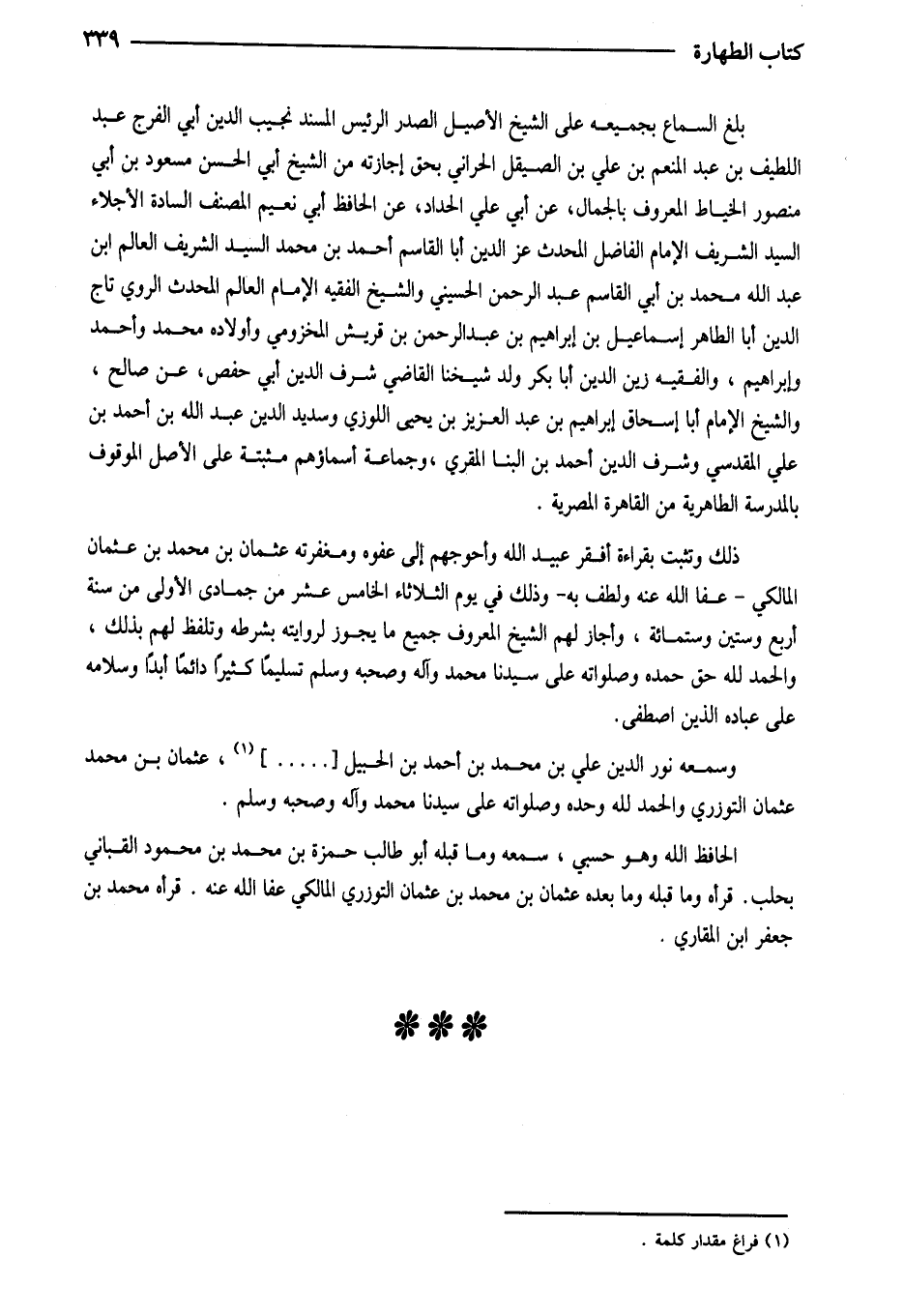 بلغ السماع بِجَمِيعِهِ على الشَّيْخ الْأَصِيل الصَّدْر الرئيس الْمسند نجيب الدَّين ابي الْفرج عبد اللَّطِيف بن عبد الْمُنعم بن عَليّ بن الصيقل الْحَرَّانِي بِحَق إِجَازَته من الشَّيْخ أَبِي الْحَسَنِ مَسْعُودِ بْنِ أَبِي مَنْصُور الْخياط الْمَعْرُوف بالجمال عَن أبي عَليّ الْحداد عَن الْحَافِظ أبي نعيم المُصَنّف السَّادة الأجلاء السَّيِّد الشريف الإِمَام الْفَاضِل الْمُحدث عز الدَّين أَبَا الْقَاسِم أَحْمد بن مُحَمَّد السَّيِّد الشريف الْعَالم ابْن عبد الله مُحَمَّد بن أبي الْقَاسِم عبد الرَّحْمَن الْحُسَيْنِي وَالشَّيْخ الْفَقِيه الإِمَام الْعَالم الْمُحدث الروي تَاج الدَّين أَبَا الطَّاهِر إِسْمَاعِيل بن إِبْرَاهِيم بن عبد الرَّحْمَن بن قُرَيْش المَخْزُومِي وَأَوْلَاده مُحَمَّد وَأحمد وَإِبْرَاهِيم والفقيه زين الدَّين أَبَا بكر ولد شَيخنَا القَاضِي شرف الدَّين أبي حَفْص عَن صَالح وَالشَّيْخ الإِمَام أَبَا إِسْحَاق إِبْرَاهِيم بن عبد الْعَزِيز بن يحيى اللوزي وسديد الدَّين عَبْدُ اللَّهِ بْنُ أَحْمَدَ بْنِ عَليّ الْمَقْدِسِي وَشرف الدَّين أَحْمد بن الْبَنَّا الْمقري وَجَمَاعَة أَسمَاؤُهُم مثبتة على الأَصْل الْمَوْقُوف بِالْمَدْرَسَةِ الطاهرية من الْقَاهِرَة المصرية ذَلِك وَتثبت بِقِرَاءَة أفقر عبيد الله وأحوجهم إِلَى عَفوه ومغفرته عُثْمَان بن مُحَمَّد بن عُثْمَان الْمَالِكِي عَفا الله عَنهُ ولطف بِهِ وَذَلِكَ فِي يَوْم الثُّلَاثَاء الْخَامِس عشر من جُمَادَى الأولى من سنة أَربع وَسِتِّينَ وسِتمِائَة وَأَجَازَ لَهُم الشَّيْخ الْمَعْرُوف جَمِيع مَا يجوز لروايته بِشَرْطِهِ وتلفظ لَهُم بذلك وَالْحَمْد لله حق حَمده وصلواته على سيدنَا مُحَمَّدٍ صَلَّى اللَّهُ عَلَيْهِ وَسَلَّمَ تَسْلِيمًا كثيرا دَائِما أبدا وَسَلَامه على عباده الَّذين اصْطفى وسَمعه نور الدَّين عَلِيِّ بْنُ مُحَمَّدِ بْنِ أَحْمَدَ بن الحبيل عُثْمَان بن مُحَمَّد عُثْمَان التوزري وَالْحَمْد لله وَحده وصلواته على سيدنَا مُحَمَّدٍ صَلَّى اللَّهُ عَلَيْهِ وَسَلَّمَ الْحَافِظ الله وَهُوَ حسبي سَمعه وَمَا قبله أَبُو طَالب حَمْزَة بن مُحَمَّد بن مَحْمُود القباني بحلب قَرَأَهُ وَمَا قبله وَمَا بعده عُثْمَان بن مُحَمَّد بن عُثْمَان التوزري الْمَالِكِي عَفا الله عَنهُ قَرَأَهُ مُحَمَّد بن جَعْفَر ابْن المقاري