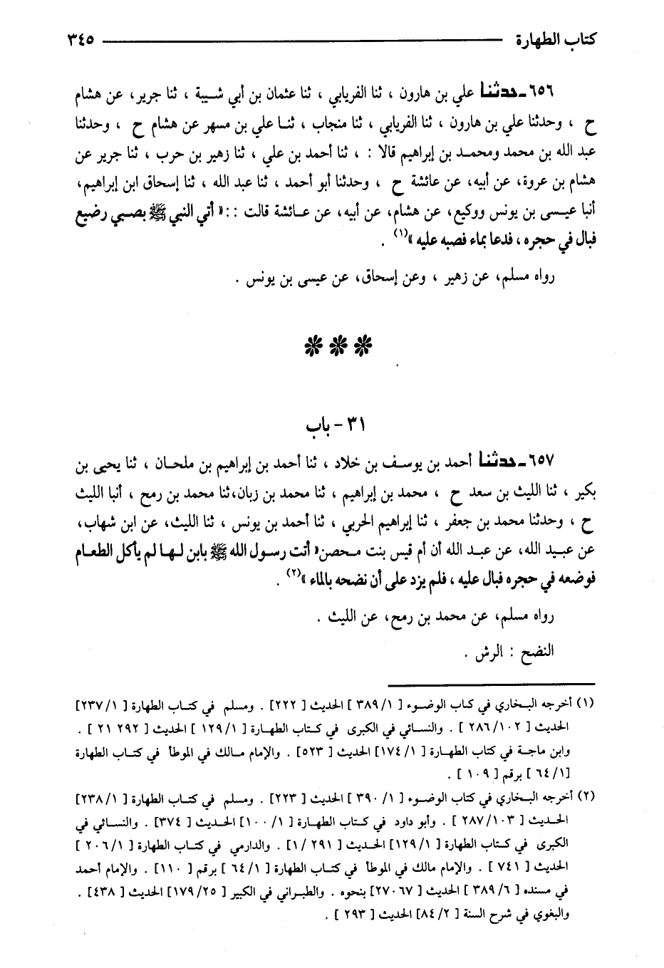 656 - حَدَّثَنَا عَلِيُّ بْنُ هَارُونَ ثَنَا الْفِرْيَابِيُّ ثَنَا عُثْمَانُ بْنُ أَبِي شَيْبَةَ ثَنَا جَرِيرٌ عَنْ هِشَامِ ح وَحَدَّثَنَا عَلِيُّ بْنُ هَارُونَ ثَنَا الْفِرْيَابِيُّ ثَنَا مِنْجَابٌ ثَنَا عَلِيُّ بْنُ مُسْهِرٍ عَنْ هِشَامٍ ح وَحَدَّثَنَا عَبْدُ اللَّهِ بْنُ مُحَمَّدٍ وَمُحَمَّدُ بْنُ إِبْرَاهِيمَ قَالا ثَنَا أَحْمَدُ بْنُ عَلِيٍّ ثَنَا زُهَيْرُ بْنُ حَرْبٍ ثَنَا جَرِيرٌ عَنْ هِشَامِ بْنِ عُرْوَةَ عَنْ أَبِيهِ عَنْ عَائِشَةَ ح وَحَدَّثَنَا أَبُو أَحْمَدَ ثَنَا عَبْدُ اللَّهِ ثَنَا إِسْحَاق ابْن إِبْرَاهِيمَ أَنْبَا عِيسَى بْنُ يُونُسَ وَوَكِيعٌ عَنْ هِشَامٍ عَنْ أَبِيهِ عَنْ عَائِشَةَ قَالَتْ (أُتِيَ النَّبِيُّ صَلَّى اللَّهُ عَلَيْهِ وَسَلَّمَ بِصَبِيٍّ رَضِيعٍ فَبَالَ فِي حِجْرِهِ فَدَعَا بِمَاءٍ فَصَبَّهُ عَلَيْهِ)