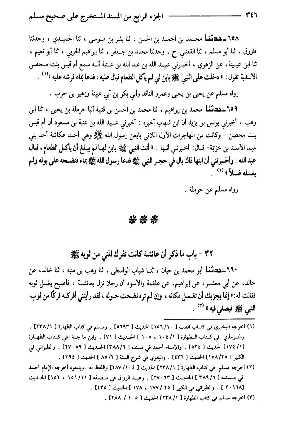 رَوَاهُ مُسْلِمٌ عَنْ يَحْيَى بْنِ يَحْيَى وَعَمْرٍو النَّاقِدِ وَأَبِي بَكْرِ بْنِ أَبِي عُيَيْنَةَ وَزُهَيْرِ بْنِ حَرْبٍ