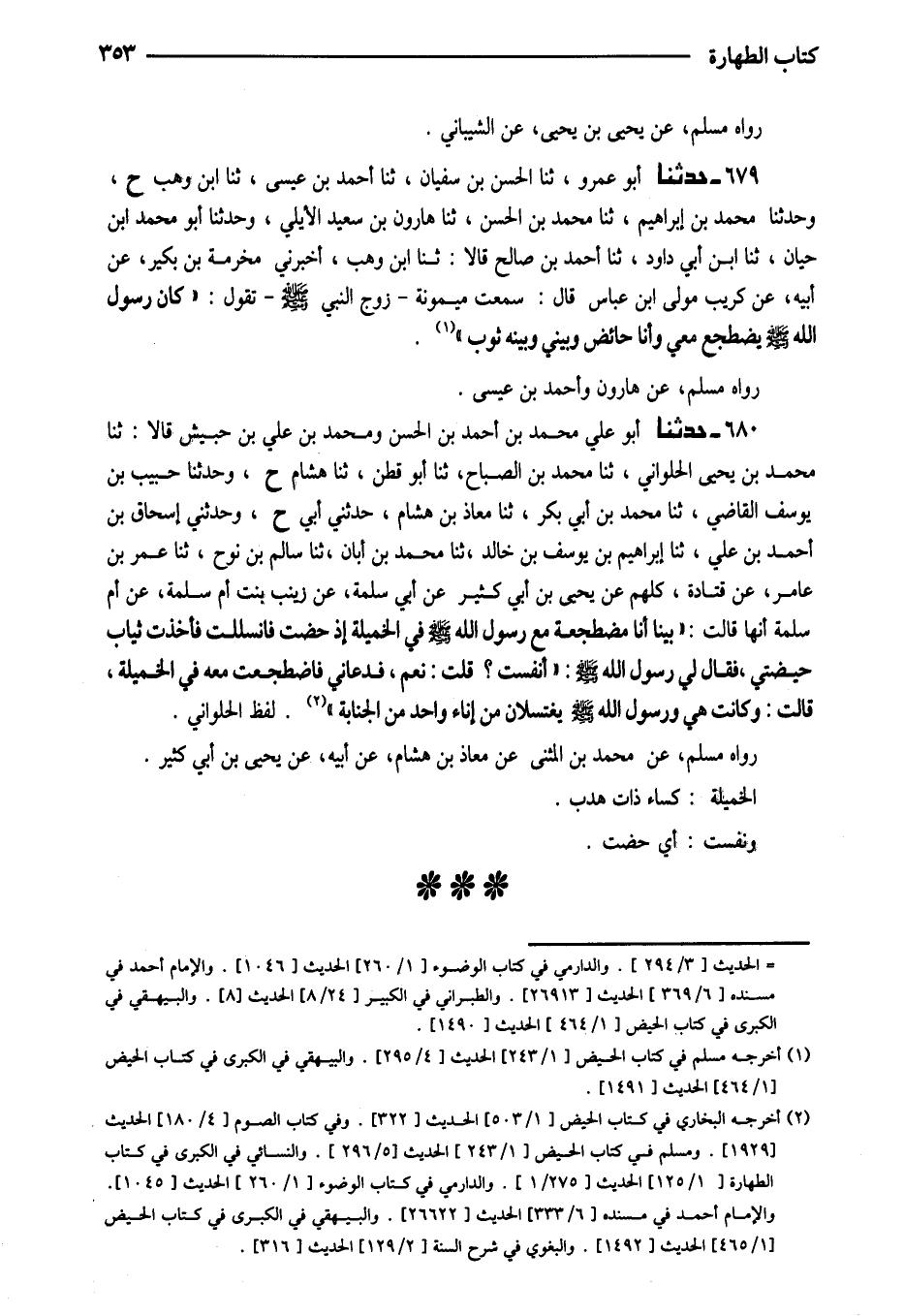 680 - حَدَّثَنَا أَبُو عَلِيٍّ مُحَمَّدُ بْنُ أَحْمَدَ بْنِ الْحَسَنِ وَمُحَمَّدُ بْنُ عَلِيِّ بْنِ حُبَيْشٍ قَالا ثَنَا مُحَمَّدُ بْنُ يَحْيَى الْحُلْوَانِيُّ ثَنَا مُحَمَّدُ بْنُ الصَّبَّاحِ ثَنَا أَبُو قَطَنٍ ثَنَا هِشَامٌ ح وَحَدَّثَنَا حبيب بن يُوسُفُ الْقَاضِي ثَنَا مُحَمَّدُ بْنُ أَبِي بَكْرٍ ثَنَا مُعَاذُ بْنُ هِشَامٍ حَدَّثَنِي أَبِي ح وَحَدَّثَنِي إِسْحَاقُ بْنُ أَحْمَدَ بْنِ عَلِيٍّ ثَنَا إِبْرَاهِيمُ بْنُ يُوسُفَ بْنِ خَالِدٍ ثَنَا مُحَمَّدُ بْنُ أَبَانَ ثَنَا سَالِمُ بْنُ نُوحٍ ثَنَا عُمَرُ بْنُ عَامِرٍ عَنْ قَتَادَةَ كُلُّهُمْ عَنْ يَحْيَى بْنِ أَبِي كَثِيرٍ عَنْ أَبِي سَلَمَةَ عَنْ زَيْنَبَ بِنْتِ أُمِّ سَلَمَةَ عَنْ أُمِّ سَلَمَةَ أَنَّهَا قَالَتْ (بَيْنَا أَنَا مُضْطَجِعَةٌ مَعَ رَسُولِ اللَّهِ صَلَّى اللَّهُ عَلَيْهِ وَسَلَّمَ فِي الْخَمِيلَةِ إِذْ حِضْتُ فَانْسَلَلْتُ فَأَخَذْتُ ثِيَابَ حَيْضَتِي فَقَالَ لِي رَسُولُ اللَّهِ صَلَّى اللَّهُ عَلَيْهِ وَسَلَّمَ (أَنَفِسْتِ قُلْتُ نَعَمْ فَدَعَانِي فَاضْطَجَعْتُ مَعَهُ فِي الْخَمِيلَةِ قَالَتْ وَكَانَتْ هِيَ وَرَسُولُ اللَّهِ صَلَّى اللَّهُ عَلَيْهِ وَسَلَّمَ يَغْتَسِلانِ مِنْ إِنَاءٍ وَاحِدٍ مِنَ الْجَنَابَةِ) لَفْظُ الْحُلْوَانِيِّ