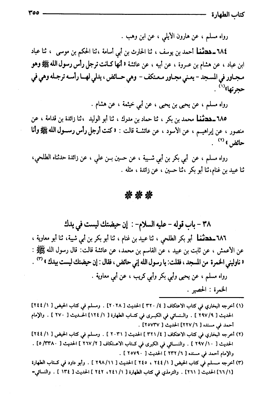 686 - حَدَّثَنَا أَبُو بَكْرٍ الطَّلْحِيُّ ثَنَا عُبَيْدُ بْنُ غَنَّامٍ ثَنَا أَبُو بَكْرِ بْنُ أَبِي شَيْبَةَ ثَنَا أَبُو مُعَاوِيَةَ عَنِ الأَعْمَشِ عَنْ ثَابِتِ بْنِ عُبَيْدٍ عَنِ الْقَاسِمِ بْنِ مُحَمَّدٍ عَنْ عَائِشَةَ قَالَتْ قَالَ رَسُولُ اللَّهِ صَلَّى اللَّهُ عَلَيْهِ وَسَلَّمَ (نَاوِلِينِي الْخُمْرَةَ مِنَ الْمَسْجِد فَقلت يارسول اللَّهِ إِنِّي حَائِضٌ فَقَالَ إِنَّ حَيْضَتَكِ لَيْسَتْ بِيَدِكِ)