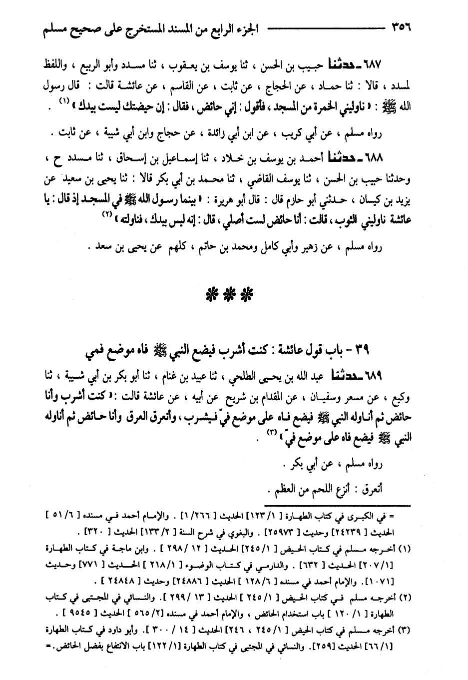 689 - حَدَّثَنَا عَبْدُ اللَّهِ بْنُ يَحْيَى الطَّلْحِيُّ ثَنَا عُبَيْدُ بْنُ غَنَّامٍ ثَنَا أَبُو بَكْرِ بْنُ أَبِي شَيْبَةَ ثَنَا وَكِيعٌ عَنْ مِسْعَرٍ وَسُفْيَانَ عَنِ الْمِقْدَامِ بْنِ شُرَيْحٍ عَنْ أَبِيهِ عَنْ عَائِشَةَ قَالَتْ (كُنْتُ أَشْرَبُ وَأَنَا حَائِضٌ ثُمَّ أُنَاوِلُهُ النَّبِيِّ صَلَّى اللَّهُ عَلَيْهِ وَسَلَّمَ فَيَضَعُ فَاهُ عَلَى مَوْضِعِ فِيَّ فَيَشْرَبُ وَأَتَعَرَّقُ الْعَرْقَ وَأَنَا حَائِضٌ ثُمَّ أُنَاوِلُهُ النَّبِيَّ صَلَّى اللَّهُ عَلَيْهِ وَسَلَّمَ فَيَضَعُ فَاهُ عَلَى مَوضِع فِي)