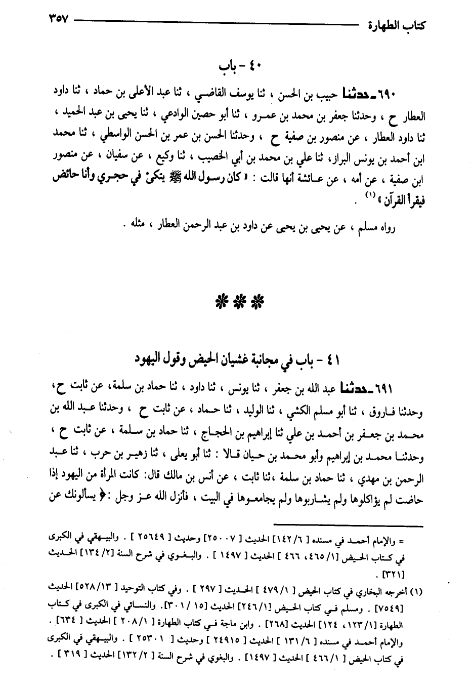 690 - حَدَّثَنَا حبيب بن الْحسن ثَنَا يُوسُفُ الْقَاضِي ثَنَا عَبْدُ الأَعْلَى بْنُ حَمَّادٍ ثَنَا دَاوُدُ الْعَطَّارُ ح وَحَدَّثَنَا جَعْفَرُ بْنُ مُحَمَّدُ بْنُ عَمْرٍو ثَنَا أَبُو حُصَيْنٍ الْوَادِعِيُّ ثَنَا يَحْيَى بْنُ عَبْدِ الْحَمِيدِ ثَنَا دَاوُدُ الْعَطَّارُ عَنْ مَنْصُورِ بْنِ صَفِيَّةَ ح وَحَدَّثَنَا الْحَسَنُ بْنُ عُمَرَ بْنِ الْحسن الوَاسِطِيّ ثَنَا مُحَمَّد ابْن أَحْمَدَ بْنِ يُونُسَ الْبَرَّازُ ثَنَا عَلِيُّ بْنُ مُحَمَّدِ بْنِ أَبِي الْخَصِيبِ ثَنَا وَكِيعٌ عَنْ سُفْيَانَ عَن مَنْصُور ابْن صَفِيَّةَ عَنْ أُمِّهِ عَنْ عَائِشَةَ أَنَّهَا قَالَتْ (كَانَ رَسُولُ اللَّهِ صلى الله عَلَيْهِ وَسلم يتكىء فِي حِجْرِي وَأَنَا حَائِضٌ فَيَقْرَأُ الْقُرْآنَ)