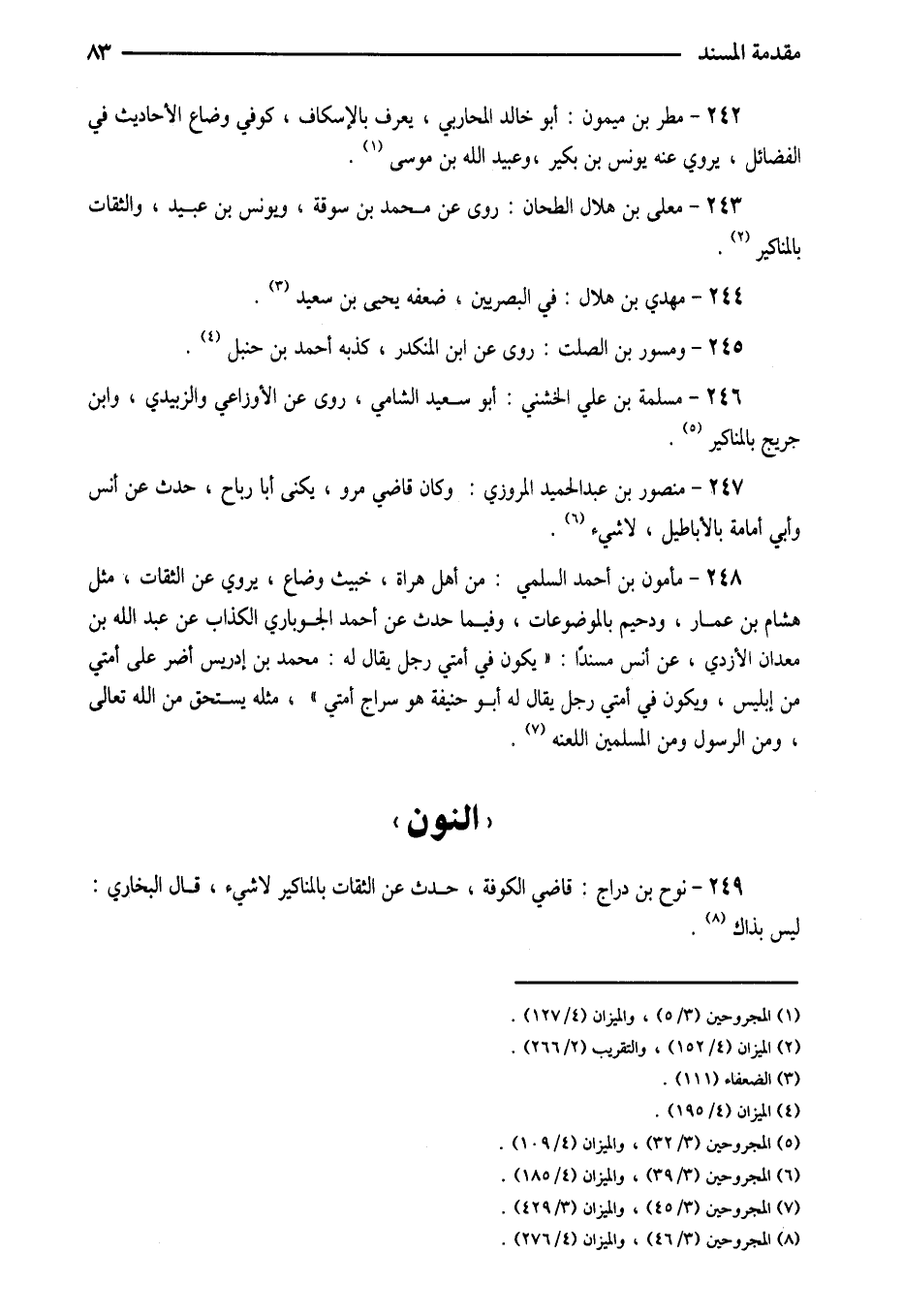 248 - مَأْمُونُ بْنُ أَحْمَدَ السُّلَمِيُّ مِنْ أَهْلِ هَرَاةَ خَبِيثٌ وَضَّاعٌ يَرْوِي عَنِ الثِّقَاتِ مِثْلَ هِشَامِ بْنِ عَمَّارٍ وَدُحَيْمٍ بِالْمَوْضُوعَاتِ وَفِيمَا حَدَّثَ عَنْ أَحْمَدَ الْجُوبَارِيِّ الْكَذَّابِ عَنْ عَبْدِ اللَّهِ بْنِ مَعْدَانَ الأَزْدِيِّ عَنْ أَنَسٍ مُسْنَدًا ((يَكُونُ فِي أُمَّتِي رَجُلٌ يُقَالُ لَهُ مُحَمَّدُ بْنُ إِدْرِيسَ أَضَرَّ عَلَى أُمَّتِي مِنْ إِبْلِيسَ وَيَكُونُ فِي أُمَّتِي رَجُلٌ يُقَالُ لَهُ أَبُو حَنِيفَةَ هُوَ سِرَاجُ أُمَّتِي)) مِثْلُهُ يَسْتَحِقُّ مِنَ اللَّهِ تَعَالَى وَمِنَ الرَّسُولِ وَمن الْمُسلمين اللَّعْنَة