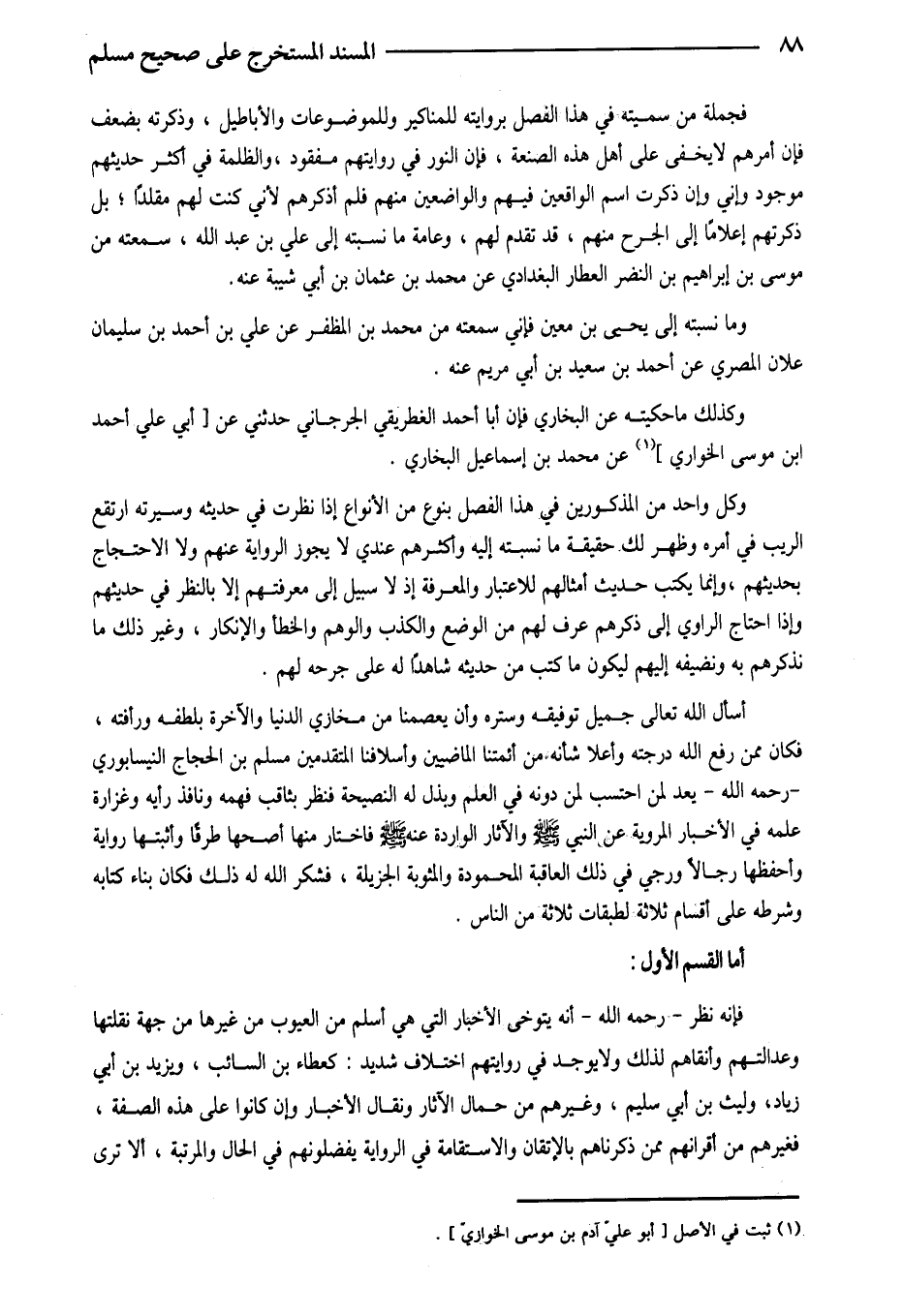 أَسْأَلُ اللَّهَ تَعَالَى جَمِيلَ تَوْفِيقِهِ وَسَتْرِهِ وَأَنْ يَعْصِمَنَا مِنْ مَخَازِي الدُّنْيَا وَالأَخِرَةِ بِلُطْفِهِ وَرَأْفَتِهِ فَكَانَ مِمَّنْ رَفَعَ اللَّهُ دَرَجَتَهُ وَأَعْلا شَأْنَهُ مِنْ أَئِمَّتِنَا الْمَاضِيِّينَ وَأَسْلافِنَا الْمُتَقَدِّمِينَ مُسْلِمُ بْنُ الْحَجَّاجِ النَّيْسَابُورِيُّ رَحِمَهُ اللَّهُ يُعَدُّ لِمَنِ احْتَسَبَ لِمَنْ دُونِهِ فِي الْعِلْمِ وَبَذَلَ لَهُ النَّصِيحَةَ فَنَظَرَ بِثَاقِبِ فَهْمِهِ وَنَافِذِ رَأْيِهِ وَغَزَارَةِ عِلْمِهِ فِي الأَخْبَارِ الْمَرْوِيَّةِ عَنِ النَّبِيِّ صَلَّى اللَّهُ عَلَيْهِ وَسَلَّمَ وَالأَثَارِ الْوَارِدَةِ عَنْهُ صَلَّى اللَّهُ عَلَيْهِ وَسَلَّمَ فَاخْتَارَ مِنْهَا أَصَحَّهَا طُرُقًا وَأَثْبَتَهَا رِوَايَةً وَأَحْفَظَهَا رِجَالا وَرُجِيَ فِي ذَلِكَ الْعَاقِبَةُ الْمَحْمُودَةُ وَالْمَثُوبَةُ الْجَزِيلَةُ فَشَكَرَ اللَّهُ لَهُ ذَلِكَ فَكَانَ بِنَاءُ كِتَابِهِ وَشَرْطِهِ عَلَى أَقْسَامٍ ثَلاثَةٍ لِطَبَقَاتٍ ثَلاثَةٍ مِنَ النَّاسِ