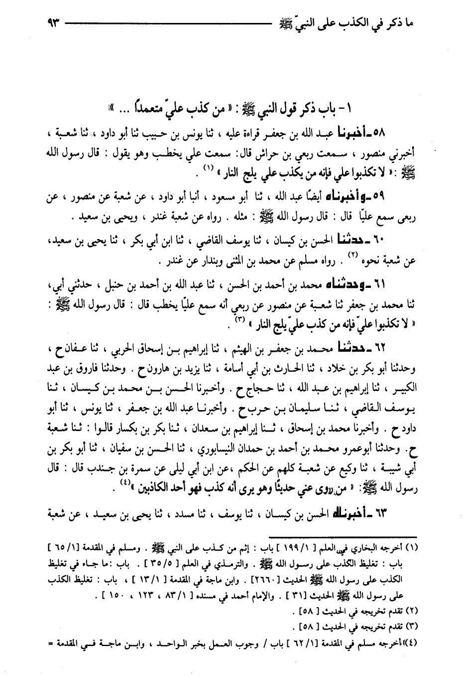 61 - وَحَدَّثَنَاهُ مُحَمَّدُ بْنُ أَحْمَدَ بْنِ الْحَسَنِ ثَنَا عَبْدُ اللَّهِ بْنُ أَحْمَدَ بْنِ حَنْبَلٍ حَدَّثَنِي أَبِي ثَنَا مُحَمَّدُ بْنُ جَعْفَرٍ ثَنَا شُعْبَةُ عَنْ مَنْصُورٍ عَنْ رِبْعِيِّ أَنَّهُ سَمِعَ عَلِيًّا يَخْطُبُ قَالَ قَالَ رَسُولُ اللَّهِ صَلَّى الله عَلَيْهِ وَسلم (لَا تكذوا عَلَيَّ فَإِنَّهُ مَنْ كَذَبَ عَلَيَّ يَلِجِ النَّارَ)