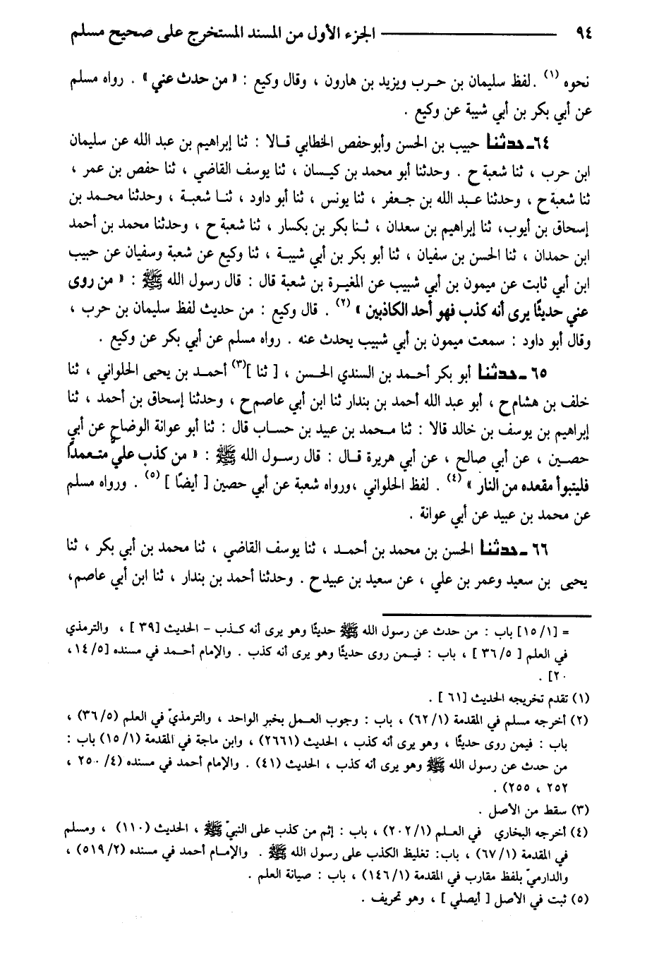 64 - حَدَّثَنَا حَبِيبُ بْنُ الْحَسَنِ وَأَبُو حَفْصٍ الْخَطَّابِيُّ قَالا ثَنَا إِبْرَاهِيمُ بْنُ عَبْدِ الله عَن سُلَيْمَان ابْن حَرْبٍ ثَنَا شُعْبَةُ ح وَحَدَّثَنَا أَبُو مُحَمَّدِ بْنُ كَيْسَانَ ثَنَا يُوسُفُ الْقَاضِي ثَنَا حَفْصُ بْنُ عمرثنا شُعْبَةُ ح وَحَدَّثَنَا عَبْدُ اللَّهِ بْنُ جَعْفَرٍ ثَنَا يُونُسُ ثَنَا أَبُو دَاوُدَ ثَنَا شُعْبَةُ وَحَدَّثَنَا مُحَمَّدُ بْنُ إِسْحَاقَ بْنِ أَيُّوبَ ثَنَا إِبْرَاهِيمُ بْنُ سَعْدَانَ ثَنَا بَكْرُ بْنُ بِكْسَارٍ ثَنَا شُعْبَةُ ح وَحَدَّثَنَا مُحَمَّدُ بْنُ أَحْمَدَ ابْنُ حَمْدَانَ ثَنَا الْحَسَنُ بْنُ سُفْيَانَ ثَنَا أَبُو بَكْرِ بْنُ أَبِي شَيْبَةَ ثَنَا وَكِيعٌ عَنْ شُعْبَة وسُفْيَان عَن حبيب ابْن أَبِي ثَابِتٍ عَنْ مَيْمُونِ بْنِ أَبِي شَبِيبٍ عَنِ الْمُغِيرَةِ بْنِ شُعْبَةَ قَالَ قَالَ رَسُولُ اللَّهِ صَلَّى اللَّهُ عَلَيْهِ وَسَلَّمَ (مِنْ روى عني حديثايرى أَنَّهُ كَذِبٌ فَهُوَ أَحَدُ الْكَاذِبِينَ) قَالَ وَكِيعٌ مِنْ حَدِيثِ لَفْظِ سُلَيْمَانَ بْنِ حَرْبٍ وَقَالَ أَبُو دَاوُدَ سَمِعْتُ مَيْمُونَ بْنَ أَبِي شَبِيبٍ يُحَدِّثُ عَنْهُ رَوَاهُ مُسْلِمٌ عَنْ أَبِي بَكْرٍ عَنْ وَكِيعٍ