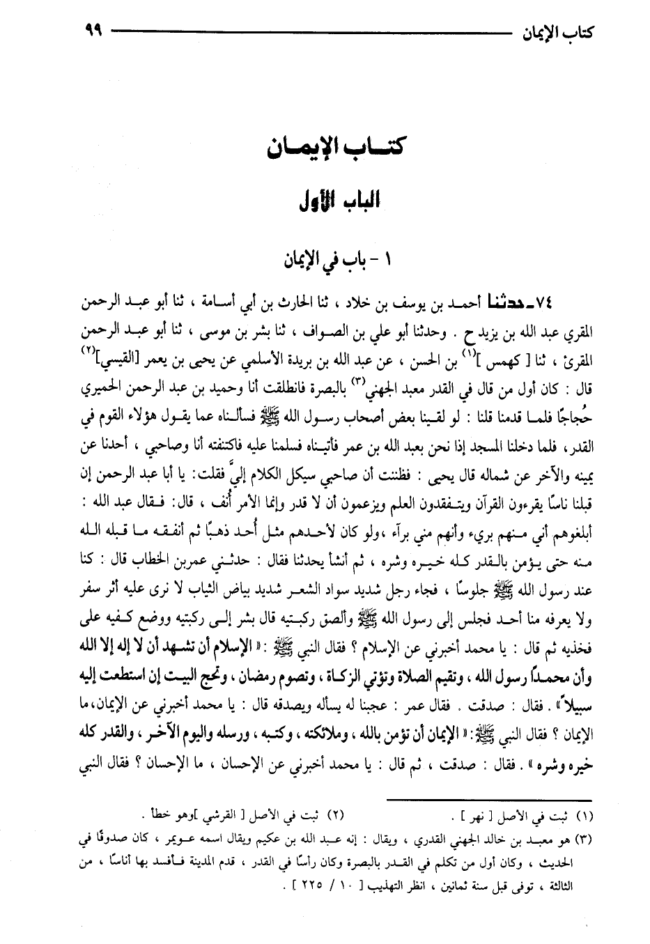 74 - حَدَّثَنَا أَحْمَدُ بْنُ يُوسُفَ بْنِ خَلادٍ ثَنَا الْحَارِثُ بْنُ أَبِي أُسَامَةَ ثَنَا أَبُو عَبْدِ الرَّحْمَنِ الْمُقْرِيُّ عَبْدُ اللَّهِ بْنُ يَزِيدَ ح وَحَدَّثَنَا أَبُو عَلِيِّ بْنُ الصَّوَّافِ ثَنَا بِشْرُ بْنُ مُوسَى ثَنَا أَبُو عَبْدِ الرَّحْمَن المقرىء ثَنَا كَهْمَسُ بْنُ الْحَسَنِ عَنْ عَبْدِ اللَّهِ بْنِ بُرَيْدَةَ الأَسْلَمِيِّ عَنْ يَحْيَى بْنِ يَعْمُرَ الْقَيْسِيِّ قَالَ كَانَ أَوَّلَ مَنْ قَالَ فِي الْقَدَرِ مَعْبَدٌ الْجُهَنِيُّ بِالْبَصْرَةِ فَانْطَلَقْتُ أَنَا وَحُمَيْدُ بْنُ عَبْدِ الرَّحْمَنِ الْحِمْيَرِيُّ حُجَّاجًا فَلَمَّا قَدِمْنَا قُلْنَا لَوْ لَقِينَا بَعْضَ أَصْحَابِ رَسُولُ اللَّهِ صَلَّى اللَّهُ عَلَيْهِ وَسَلَّمَ فَسَأَلْنَاهُ عَمَّا يَقُولُ هَؤُلاءِ الْقَوْمُ فِي الْقَدَرِ فَلَمَّا دَخَلْنَا الْمَسْجِدَ إِذَا نَحْنُ بِعَبْدِ اللَّهِ بْنِ عُمَرَ فَأَتَيْنَاهُ فَسَلَّمْنَا عَلَيْهِ فَاكْتَنَفْتُهُ أَنَا وَصَاحِبِي أَحَدُنَا عَنْ يَمِينِهِ وَالآخَرُ عَنْ شِمَالِهِ قَالَ يَحْيَى فَظَنَنْتُ أَنَّ صَاحِبِي سَيَكِلُ الْكَلامَ إِلَيَّ فَقُلْتُ يَا أَبَا عَبْدَ الرَّحْمَنِ إِنَّ قِبَلَنَا نَاسًا يَقْرَءُونَ الْقُرْآنَ وَيَتَفَقَّدُونَ الْعِلْمَ وَيَزْعُمُونَ أَنَّ لَا قَدَرَ وَإِنَّمَا الأَمْرُ أُنُفٌ قَالَ فَقَالَ عَبْدُ اللَّهِ أَبْلِغُوهُمْ أَنِّي مِنْهُمْ بَرِيءٌ وَأَنَّهُمْ مِنِّي بُرَآءٌ وَلَوْ كَانَ لأَحَدِهِمْ مِثْلُ أُحُدٍ ذَهَبًا ثُمَّ أنَفْقَهُ مَا قَبِلَهُ اللَّهُ مِنْهُ حَتَّى يُؤْمِنَ بِالْقَدَرِ كُلِّهِ خَيْرِهِ وَشَرِّهِ ثُمَّ أَنْشَأَ يُحَدِّثُنَا فَقَالَ حَدَّثَنِي عُمَرُ بْنُ الْخَطَّابِ قَالَ كُنَّا عِنْدَ رَسُولِ اللَّهِ صَلَّى اللَّهُ عَلَيْهِ وَسَلَّمَ جُلُوسًا فَجَاءَ رَجُلٌ شَدِيدُ سَوَادِ الشَّعْرِ شَدِيدُ بَيَاضِ الثِّيَابِ لَا نَرَى عَلَيْهِ أَثَرَ سَفَرٍ وَلا يَعْرِفُهُ مِنَّا أَحَدٌ فَجَلَسَ إِلَى رَسُولِ اللَّهِ صَلَّى اللَّهُ عَلَيْهِ وَسَلَّمَ وَأَلْصَقَ رُكْبَتَيْهِ قَالَ بِشْرٌ إِلَى رُكْبَتَيْهِ وَوَضَعَ كَفَّيْهِ عَلَى فَخِذَيْهِ ثُمَّ قَالَ يَا مُحَمَّدُ أَخْبِرْنِي عَنِ الإِسْلامِ فَقَالَ النَّبِيُّ صَلَّى اللَّهُ عَلَيْهِ وَسَلَّمَ) الإِسْلامُ أَنْ تَشْهَدَ أَنْ لَا إِلَهَ إِلا اللَّهُ وَأَنَّ مُحَمَّدًا رَسُولُ اللَّهِ وَتُقِيمَ الصَّلاةَ وَتُؤْتِيَ الزَّكَاةَ وَتَصُومَ رَمَضَانَ وَتَحُجَّ الْبَيْتَ إِنِ اسْتَطَعْتَ إِلَيْهِ سَبِيلا) فَقَالَ صَدَقْتَ فَقَالَ عُمَرُ عَجِبْنَا لَهُ يَسْأَلُهُ وَيُصَدِّقُهُ قَالَ يَا مُحَمَّدُ أَخْبِرْنِي عَنِ الإِيمَانِ مَا الإِيمَانُ قَالَ النَّبِيُّ صَلَّى اللَّهُ عَلَيْهِ وَسَلَّمَ (الإِيمَانُ أَنْ تُؤْمِنَ بِاللَّهِ وَمَلائِكَتِهِ وَكُتُبِهِ وَرُسُلِهِ وَالْيَوْمِ الآخِرِ وَالْقَدَرِ كُلِّهِ خَيْرِهِ وَشَرِّهِ) فَقَالَ صَدَقْتَ ثُمَّ قَالَ يَا مُحَمَّدُ أَخْبِرْنِي عَنِ الإِحْسَانِ مَا الإِحْسَانُ فَقَالَ النَّبِيُّ