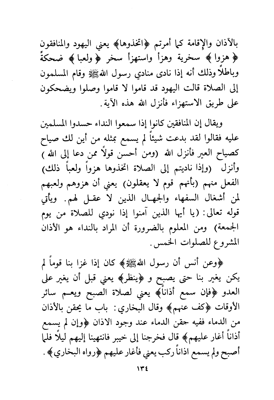 (وعن أنس أن رسول الله – - صلى الله عليه وسلم -) كان إذا غزا بنا قومًا لم يكن يغير بنا حتى يصبح و (ينظر) يعني قبل أن يغير على العدو (فإن سمع أذانًا) يعني لصلاة الصبح ويعم سائر الأوقات (كف عنهم) وقال البخاري: باب ما يحقن بالأذان من الدماء ففيه حقن الدماء عند وجود الأذان (وإن لم يسمع أذانًا أغار عليهم) قال فخرجنا إلى خيبر فانتهينا إليهم ليلاً فلما أصبح ولم يسمع أذانًا ركب يعني فأغار عليهم (رواه البخاري).