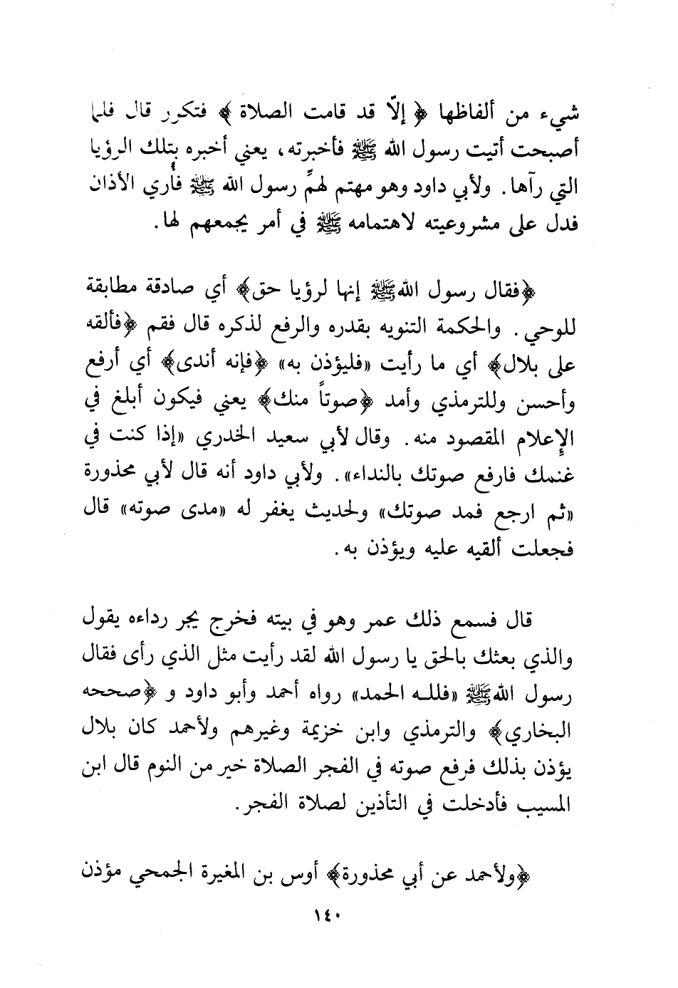 قال فسمع ذلك عمر وهو في بيته فخرج يجر رداءه يقول والذي بعثك بالحق يا رسول الله لقد رأيت مثل الذي رأى فقال رسول الله – - صلى الله عليه وسلم - "فلله الحمد" رواه أحمد وأبو داود و (صححه البخاري) والترمذي وابن خزيمة وغيرهم ولأحمد كان بلال يؤذن بذلك فرفع صوته في الفجر الصلاة خير من النوم قال ابن المسيب فأدخلت في التأذين لصلاة الفجر.