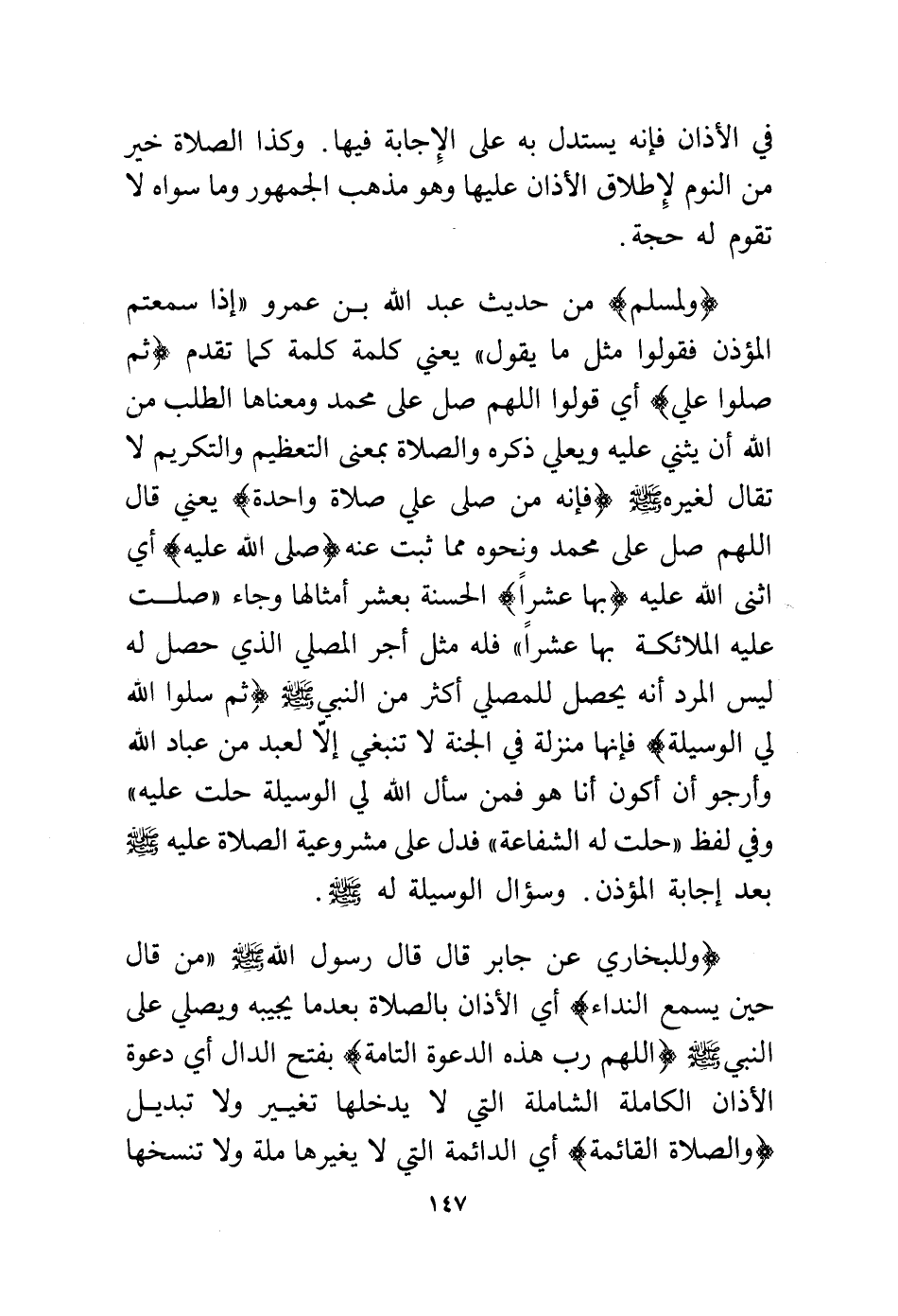 (ولمسلم) من حديث عبد الله بن عمرو "إذا سمعتم المؤذن فقولوا مثل ما يقول" يعني كلمة كلمة كما تقدم (ثم صلوا علي) أي قولوا اللهم صل على محمد ومعناها الطلب من الله أن يثني عليه ويعلي ذكره والصلاة بمعنى التعظيم والتكريم لا تقال لغيره - صلى الله عليه وسلم - (فإنه من صلى علي صلاة واحدة) يعني قال اللهم صل على محمد ونحوه مما ثبت عنه (صلى الله عليه) أي أثنى الله عليه (بها عشرًا) الحسنة بعشر أمثالها وجاء "صلت عليه الملائكة بها عشرًا" فله مثل أجر المصلي الذي حصل له ليس المرد أنه يحصل للمصلي أكثر من النبي - صلى الله عليه وسلم - (ثم سلوا الله لي الوسيلة) فإنها منزلة في الجنة لا تنبغي إلا لعبد من عباد الله وأرجو أن أكون أنا هو فمن سأل الله لي الوسيلة حلت عليه"، وفي لفظ "حلت له الشفاعة" فدل على مشروعية الصلاة عليه - صلى الله عليه وسلم - بعد إجابة المؤذن. وسؤال الوسيلة له - صلى الله عليه وسلم -.