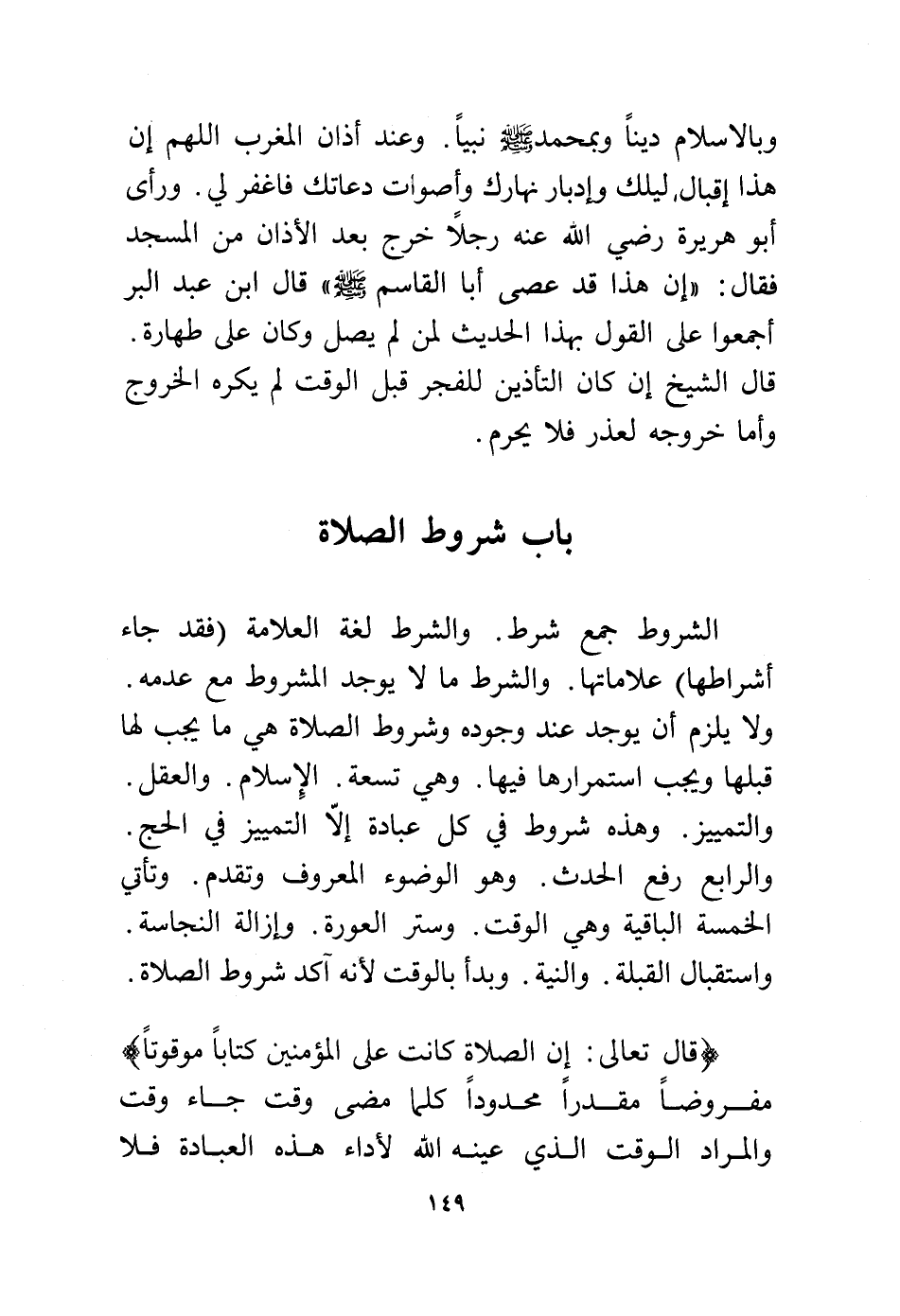 ولا يلزم أن يوجد عند وجوده وشروط الصلاة هي ما يجب لها قبلها ويجب استمرارها فيها. وهي تسعة الإسلام. والعقل والتمييز. وهذه شروط في كل عبادة إلا التمييز في الحج.
