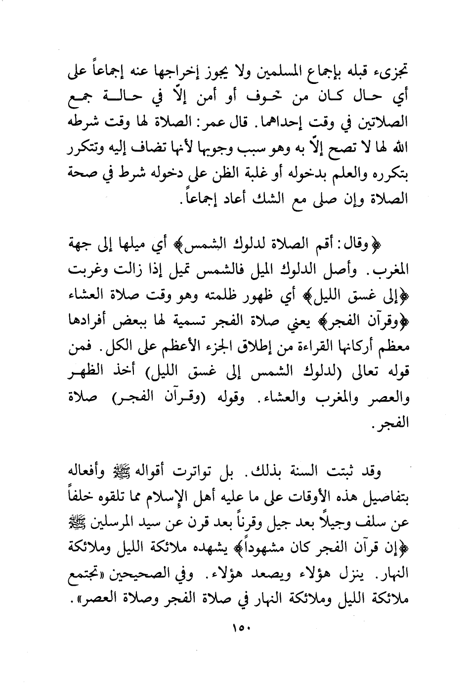 وقد ثبتت السنة بذلك. بل تواترت أقواله – - صلى الله عليه وسلم - وأفعاله بتفاصيل هذه الأوقات على ما عليه أهل الإسلام مما تلقوه خلفًا عن سلف وجيلاً بعد جيل وقرنًا بعد قرن عن سيد المرسلين – - صلى الله عليه وسلم - {إِنَّ قُرْآنَ الْفَجْرِ كَانَ مَشْهُودًا} يشهده ملائكة الليل وملائكة النهار. ينزل هؤلاء ويصعد هؤلاء. وفي الصحيحين "تجتمع ملائكة الليل وملائكة النهار في صلاة الفجر وصلاة العصر".