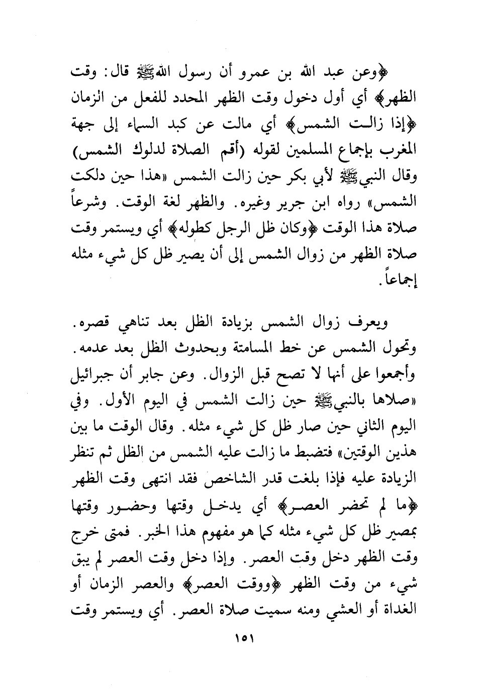 (وعن عبد الله بن عمرو أن رسول الله – - صلى الله عليه وسلم - قال: وقت الظهر) أي أول دخول وقت الظهر المحدد للفعل من الزمان (إذا زالت الشمس) أي مالت عن كبد السماء إلى جهة المغرب بإجماع المسلمين لقوله {أَقِمِ الصَّلاَةَ لِدُلُوكِ الشَّمْسِ} وقال النبي – - صلى الله عليه وسلم - لأبي بكر حين زالت الشمس "هذا حين دلكت الشمس" رواه ابن جرير وغيره. والظهر لغة الوقت. وشرعًا صلاة هذا الوقت (وكان ظل الرجل كطوله) أي ويستمر وقت صلاة الظهر من زوال الشمس إلى أن يصير ظل كل شيء مثله إجماعًا.