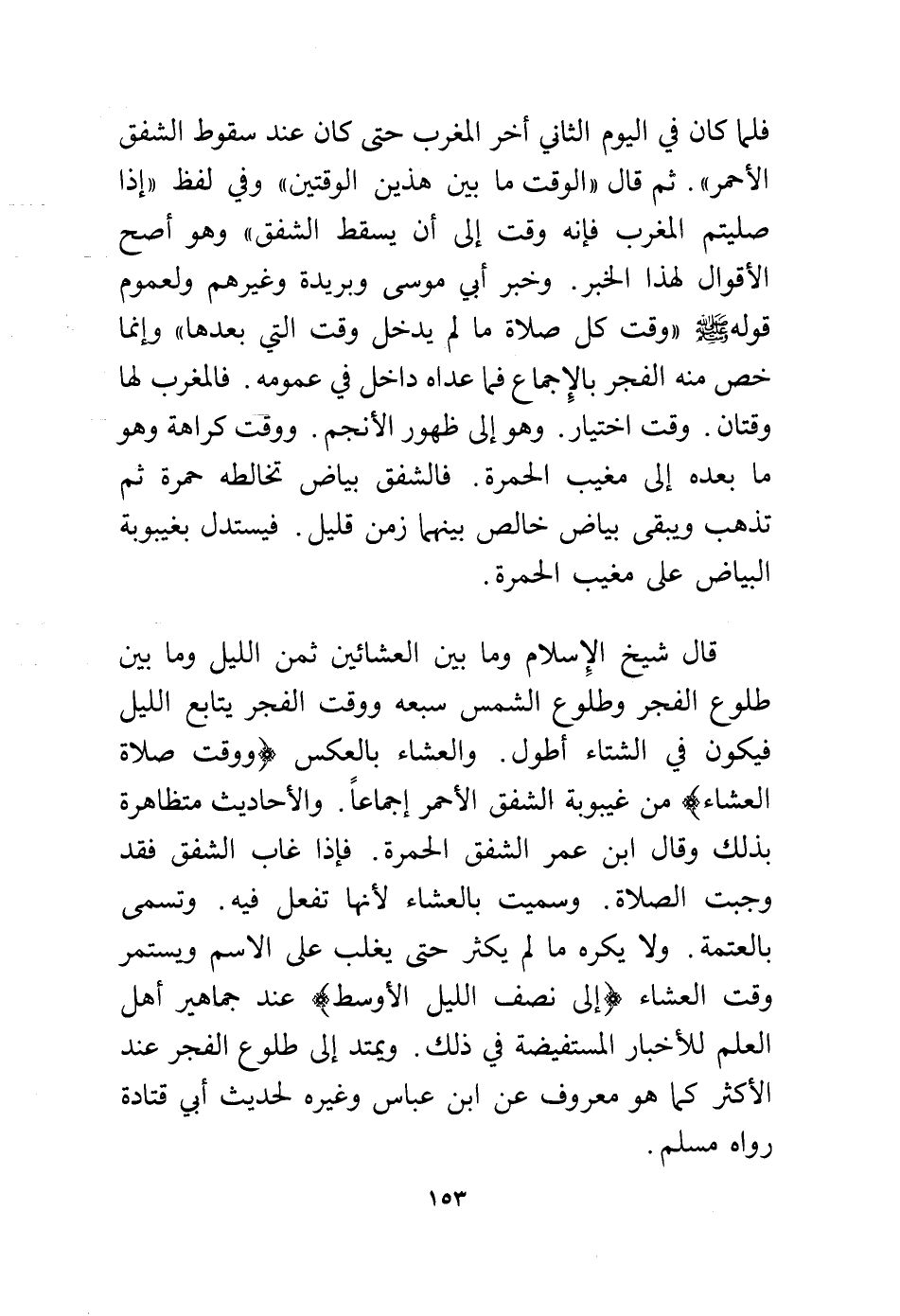 قال شيخ الإسلام وما بين العشائين ثمن الليل وما بين طلوع الفجر وطلوع الشمس سبعه ووقت الفجر يتابع الليل فيكون في الشتاء أطول. والعشاء بالعكس (ووقت صلاة العشاء) من غيبوبة الشفق الأحمر إجماعًا. والأحاديث متظاهرة بذلك وقال ابن عمر الشفق الحمرة. فإذا غاب الشفق فقد وجبت الصلاة. وسميت بالعشاء لأنها تفعل فيه. وتسمى بالعتمة. ولا يكره ما لم يكثر حتى يغلب على الاسم ويستمر وقت العشاء (إلى نصف الليل الأوسط) عند جماهير أهل العلم للأخبار المستفيضة في ذلك. ويمتد إلى طلوع الفجر عند الأكثر كما هو معروف عن ابن عباس وغيره لحديث أبي قتادة رواه مسلم.