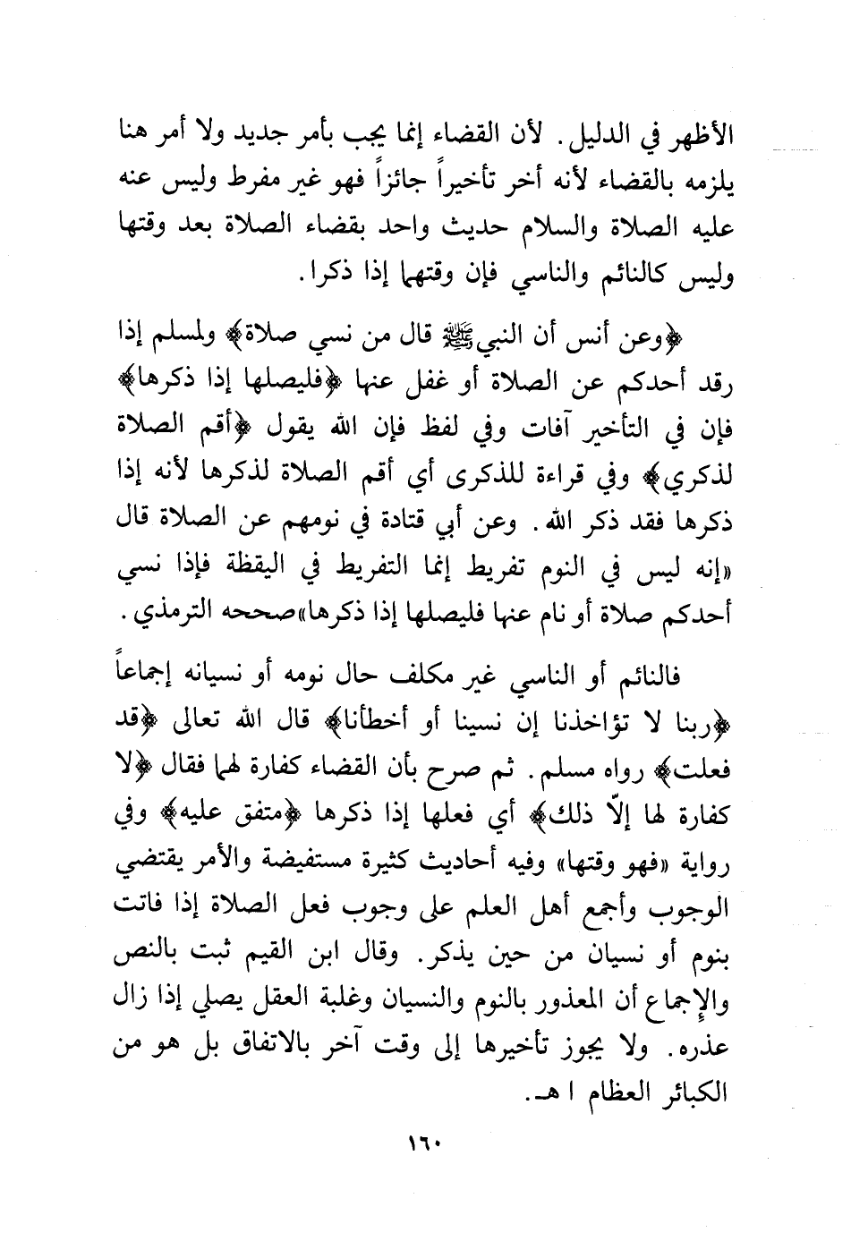 فالنائم أو الناسي غير مكلف حال نومه أو نسيانه إجماعًا {رَبَّنَا لاَ تُؤَاخِذْنَا إِن نَّسِينَا أَوْ أَخْطَأْنَا} قال الله تعالى (قد فعلت) رواه مسلم. ثم صرح بأن القضاء كفارة لهما فقال (لا كفارة لها إلا ذلك) أي فعلها إذا ذكرها (متفق عليه) وفي رواية "فهو وقتها" وفيه أحاديث كثيرة مستفيضة والأمر يقتضي الوجوب وأجمع أهل العلم على وجوب فعل الصلاة إذا فاتت بنوم أو نسيان من حين يذكر. وقال ابن القيم ثبت بالنص والإجماع أن المعذور بالنوم والنسيان وغلبة العقل يصلي إذا زال عذره. ولا يجوز تأخيرها إلى وقت آخر بالاتفاق بل هو من الكبائر العظام اهـ.