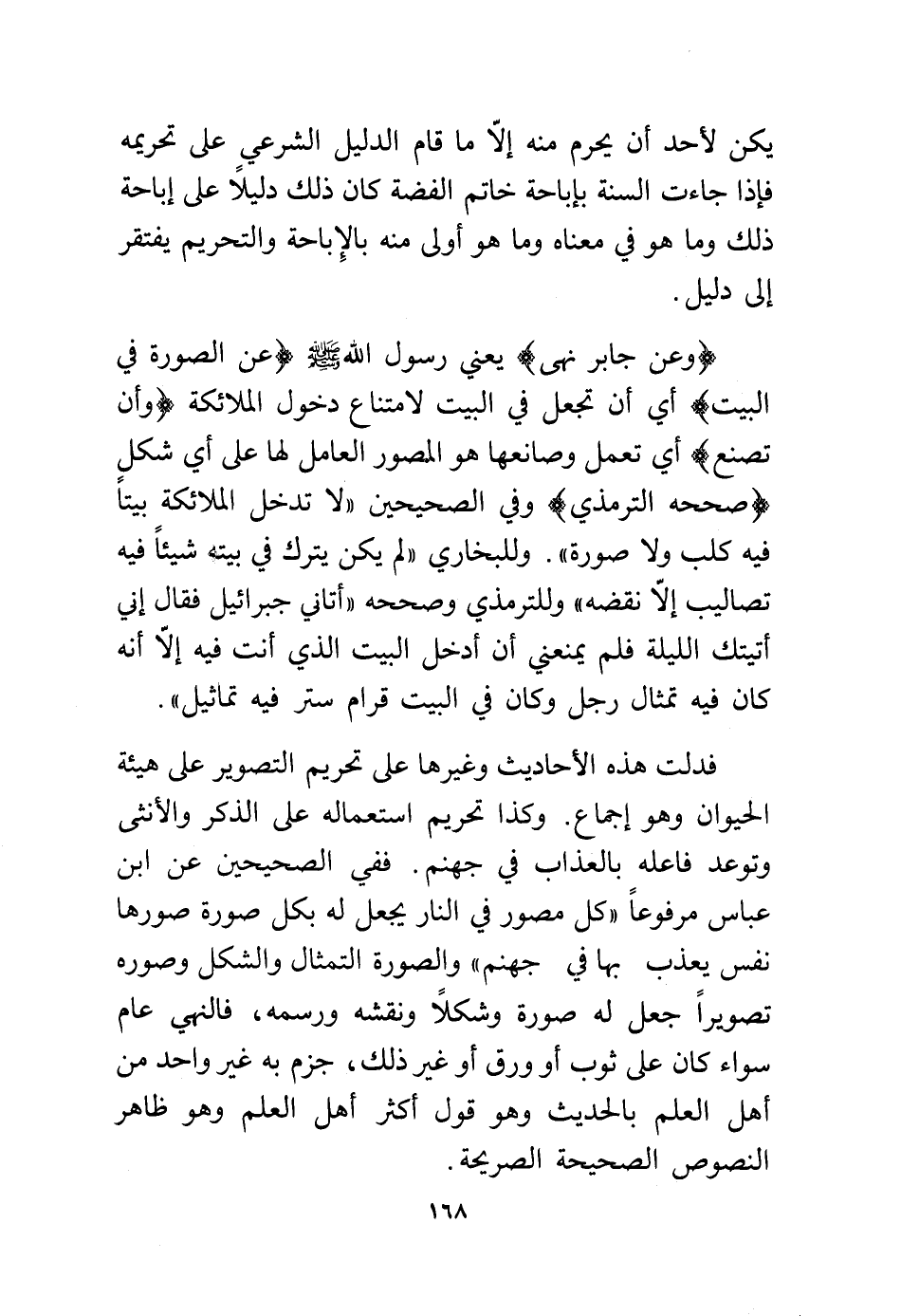 فدلت هذه الأحاديث وغيرها على تحريم التصوير على هيئة الحيوان وهو إجماع. وكذا تحريم استعماله على الذكر والأنثى وتوعد فاعله بالعذاب في جهنم. ففي الصحيحين عن ابن عباس مرفوعًا "كل مصور في النار يجعل له بكل صورة صورها نفس يعذب بها في جهنم" والصورة التمثال والشكل وصوره تصويرًا جعل له صورة وشكلاً ونقشه ورسمه، فالنهي عام سواء كان على ثوب أو ورق أو غير ذلك، جزم به غير واحد من أهل العلم بالحديث وهو قول أكثر أهل العلم وهو ظاهر النصوص الصحيحة الصريحة.