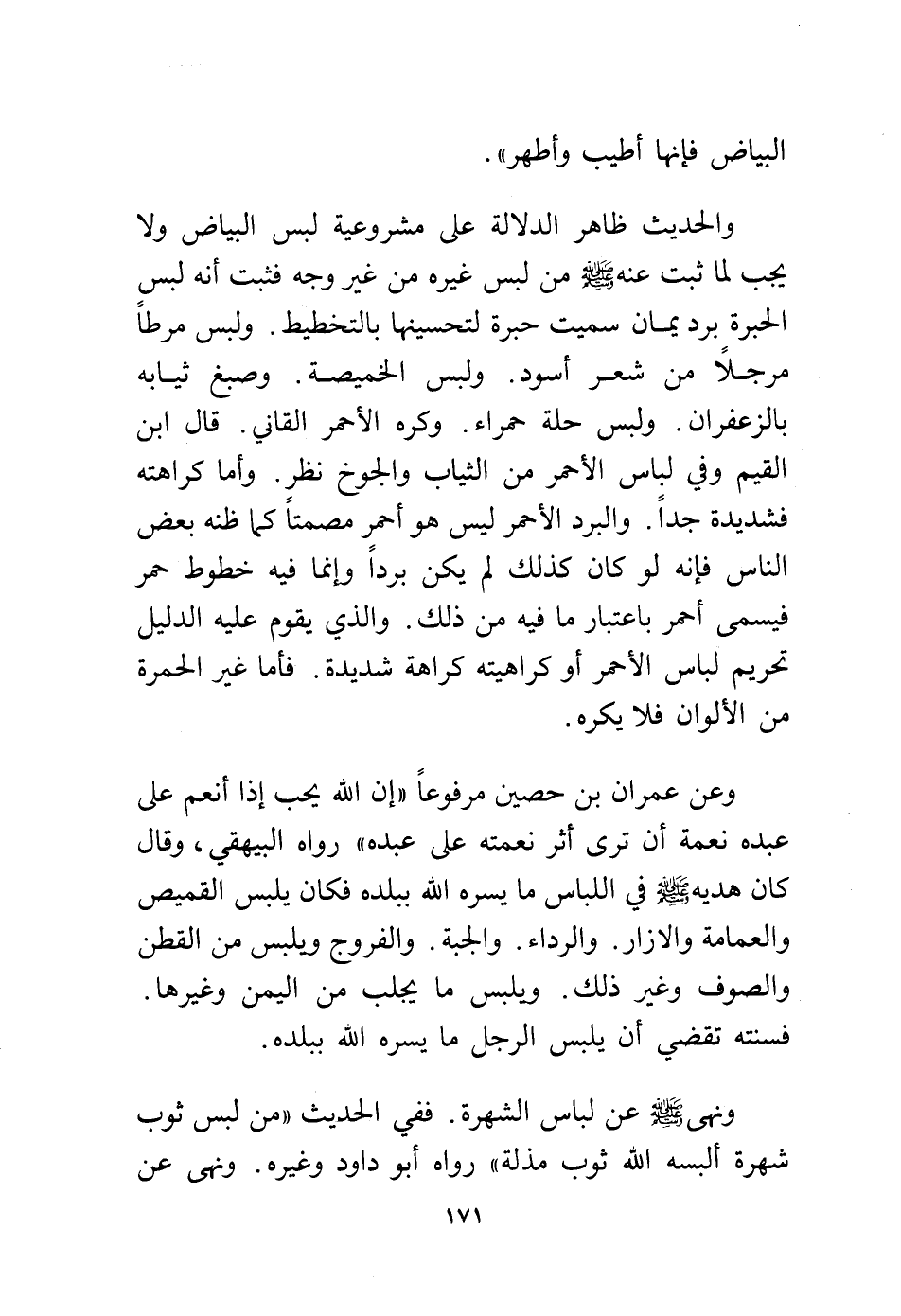 وعن عمران بن حصين مرفوعًا "إن الله يحب إذا أنعم على عبده نعمة أن ترى أثر نعمته على عبده" رواه البيهقي، وقال كان هديه – - صلى الله عليه وسلم - في اللباس ما يسره الله ببلده، فكان يلبس القميص والعمامة والإزار. والرداء. والجبة. والفروج ويلبس من القطن والصوف وغير ذلك. ويلبس ما يجلب من اليمن وغيرها. فسنته تقضي أن يلبس الرجل ما يسره الله ببلده.