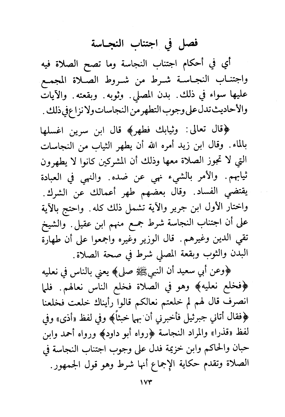 واختار الأول ابن جرير والآية تشمل ذلك كله. واحتج بالآية على أن اجتناب النجاسة شرط جمع منهم ابن عقيل. والشيخ تقي الدين وغيرهم. قال الوزير وغيره واجمعوا على أن طهارة البدن والثوب وبقعة المصلي شرط في صحة الصلاة.