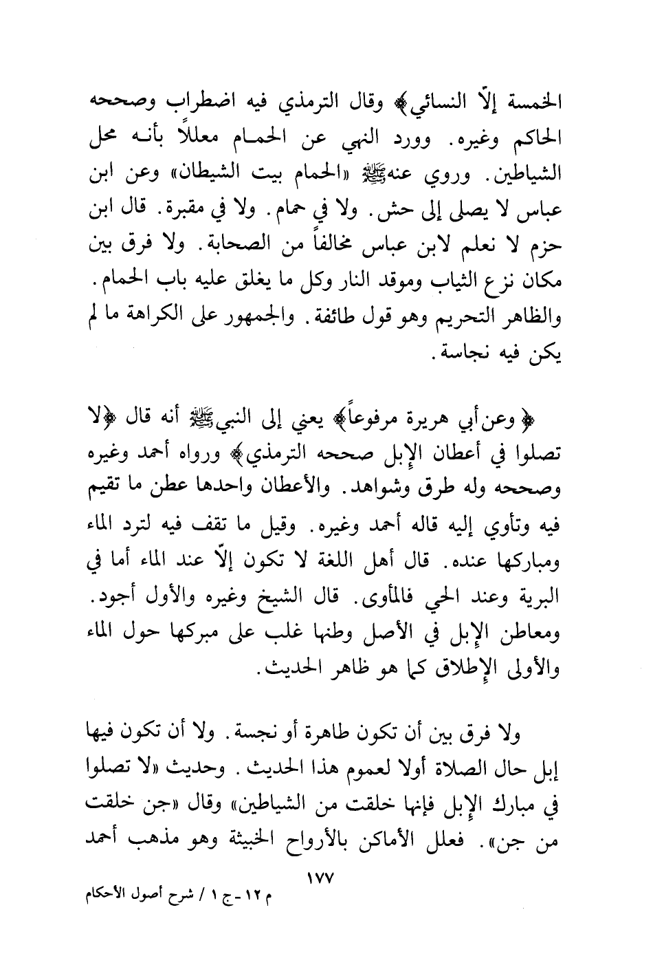 (وعن أبي هريرة مرفوعًا) يعني إلى النبي – - صلى الله عليه وسلم - أنه قال (لا تصلوا في أعطان الإبل صححه الترمذي) ورواه أحمد وغيره وصححه وله طرق وشواهد. والأعطان واحدها عطن ما تقيم فيه وتأوي إليه قاله أحمد وغيره. وقيل ما تقف فيه لترد الماء ومباركها عنده. قال أهل اللغة لا تكون إلا عند الماء أما في البرية وعند الحي فالمأوى. قال الشيخ وغيره والأول أجود. ومعاطن الإبل في الأصل وطنها غلب على مبركها حول الماء والأولى الإطلاق كما هو ظاهر الحديث.