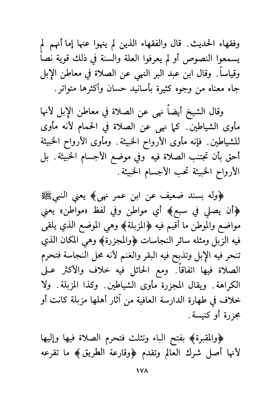 وقال الشيخ أيضًا نهى عن الصلاة في معاطن الإبل لأنها مأوى الشياطين. كما نهى عن الصلاة في الحمام لأنه مأوى للشياطين. فإنه مأوى الأرواح الخبيثة ومأوى الأرواح الخبيثة. ومأوى الأرواح الخبيثة أحق بأن تجتنب الصلاة فيه، وفي موضع الأجسام الخبيثة. بل الأرواح الخبيثة تحب الأجسام الخبيثة.