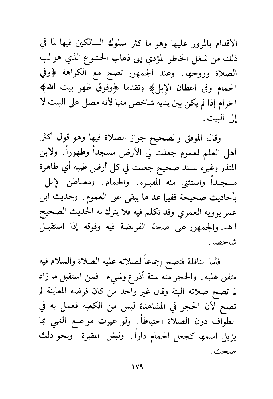 وقال الموفق والصحيح جواز الصلاة فيها وهو قول أكثر أهل العلم لعموم جعلت لي الأرض مسجدًا وطهورًا. ولابن المنذر وغيره بسند صحيح جعلت لي كل أرض طيبة أي طاهرة مسجدًا واستثنى منه المقبرة. والحمام ومعاطن الإبل. بأحاديث صحيحة ففيما عداها يبقى على العموم. وحديث ابن عمر يرويه العمري وقد تكلم فيه فلا يترك به الحديث الصحيح اهـ. والجمهور على صحة الفريضة فيه وفوقه إذا استقبل شاخصًا.