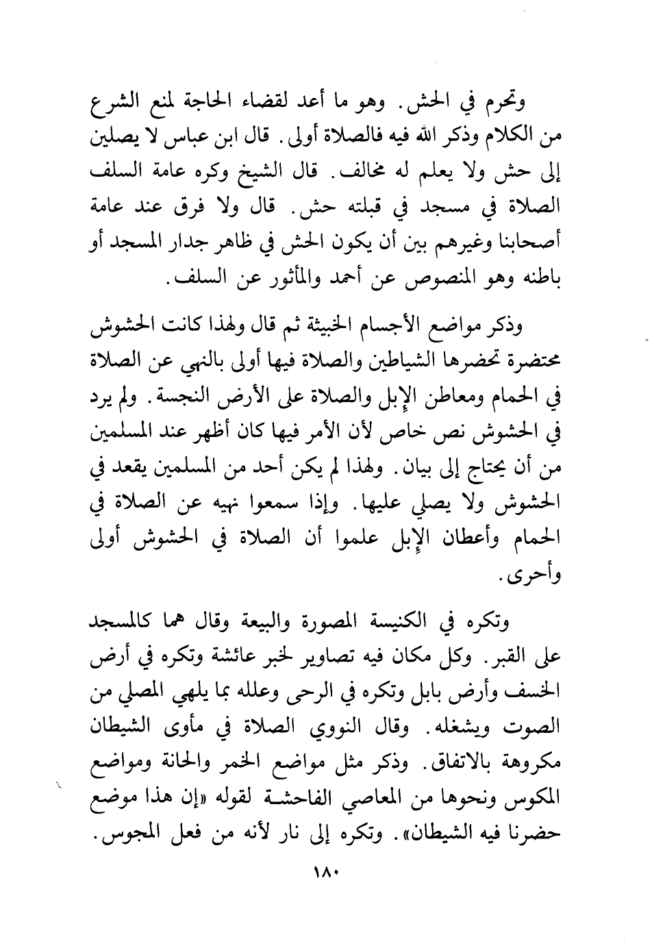 وذكر مواضع الأجسام الخبيثة ثم قال ولهذا كانت الحشوش محتضرة تحضرها الشياطين والصلاة فيها أولى بالنهي عن الصلاة في الحمام ومعاطن الإبل والصلاة على الأرض النجسة. ولم يرد في الحشوش نص خاص لأن الأمر فيها كان أظهر عند المسلمين من أن يحتاج إلى بيان. ولهذا لم يكن أحد من المسلمين يقعد في الحشوش ولا يصلي عليها. وإذا سمعوا نهيه عن الصلاة في الحمام وأعطان الإبل علموا أن الصلاة في الحشوش أولى وأحرى.