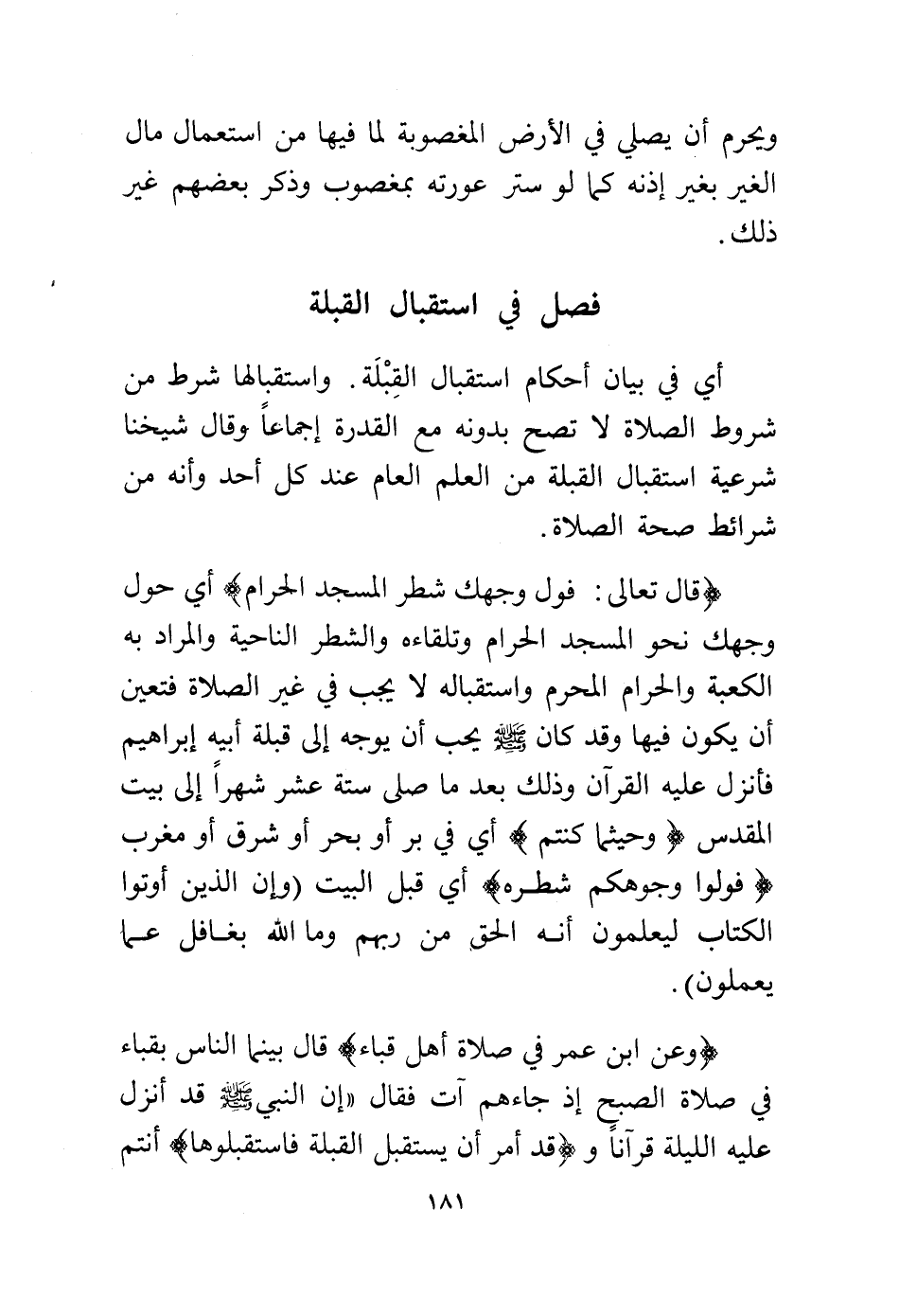 (قال تعالى: {فَوَلِّ وَجْهَكَ شَطْرَ الْمَسْجِدِ الْحَرَامِ} أي حول وجهك نحو المسجد الحرام وتلقاءه والشطر الناحية والمراد به الكعبة والحرام المحرم واستقباله لا يجب في غير الصلاة فتعين أن يكون فيها وقد كان – - صلى الله عليه وسلم - يحب أن يوجه إلى قبلة أبيه إبراهيم فأنزل عليه القرآن وذلك بعد ما صلى ستة عشر شهرًا إلى بيت المقدس {وَحَيْثُ مَا كُنتُمْْ} أي في بر أو بحر أو شرق أو مغرب {فَوَلُّواْ وُجُوِهَكُمْ شَطْرَهُ} أي قبل البيت {وَإِنَّ الَّذِينَ أُوْتُواْ الْكِتَابَ لَيَعْلَمُونَ أَنَّهُ الْحَقُّ مِن رَّبِّهِمْ وَمَا اللهُ بِغَافِلٍ عَمَّا يَعْمَلُون}.