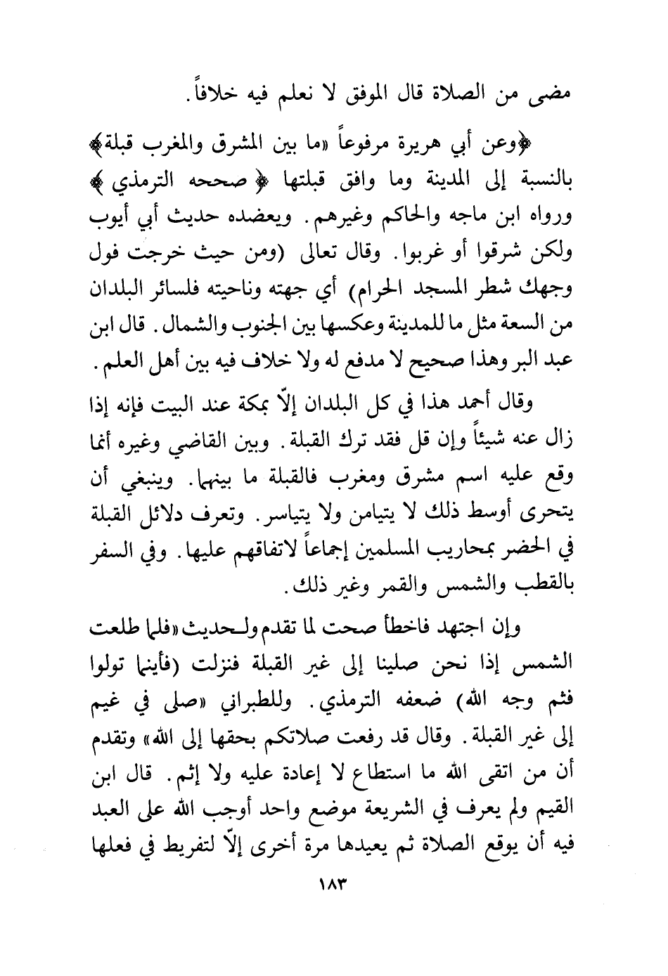 (وعن أبي هريرة مرفوعًا "ما بين المشرق والمغرب قبلة) بالنسبة إلى المدينة وما وافق قبلتها (صححه الترمذي) ورواه ابن ماجه والحاكم وغيرهم. ويعضده حديث أبي أيوب ولكن شرقوا أو غربوا. وقال تعالى: {وَمِنْ حَيْثُ خَرَجْتَ فَوَلِّ وَجْهَكَ شَطْرَ الْمَسْجِدِ الْحَرَامِ} أي جهته وناحيته فلسائر البلدان من السعة مثل ما للمدينة وعكسها بين الجنوب والشمال. قال ابن عبد البر وهذا صحيح لا مدفع له ولا خلاف فيه بين أهل العلم.