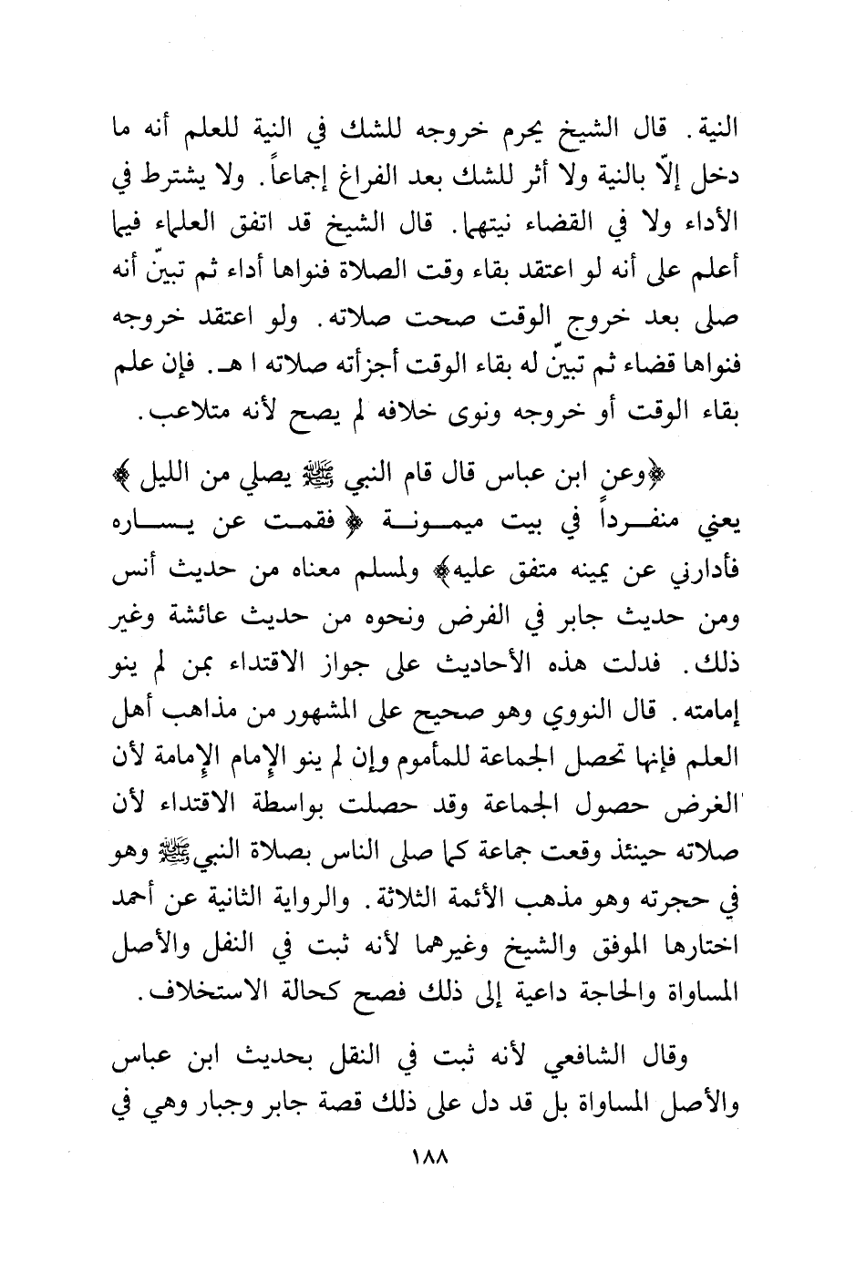 (وعن ابن عباس قال قام النبي – - صلى الله عليه وسلم - يصلي من الليل) يعني منفردًا في بيت ميمونة (فقمت عن يساره فأدارني عن يمينه متفق عليه) ولمسلم معناه من حديث أنس ومن حديث جابر في الفرض ونحوه من حديث عائشة وغير ذلك. فدلت هذه الأحاديث على جواز الاقتداء بمن لم ينو إمامته. قال النووي وهو صحيح على المشهور من مذاهب أهل العلم فإنها تحصل الجماعة للمأموم وإن لم ينو الإمام الإمامة لأن الغرض حصول الجماعة وقد حصلت بواسطة الاقتداء لأن صلاته حينئذ وقعت جماعة كما صلى الناس بصلاة النبي – - صلى الله عليه وسلم - وهو في حجرته وهو مذهب الأئمة الثلاثة. والرواية الثانية عن أحمد اختارها الموفق والشيخ وغيرهما لأنه ثبت في النفل والأصل المساواة والحاجة داعية إلى ذلك فصح كحالة الاستخلاف.
