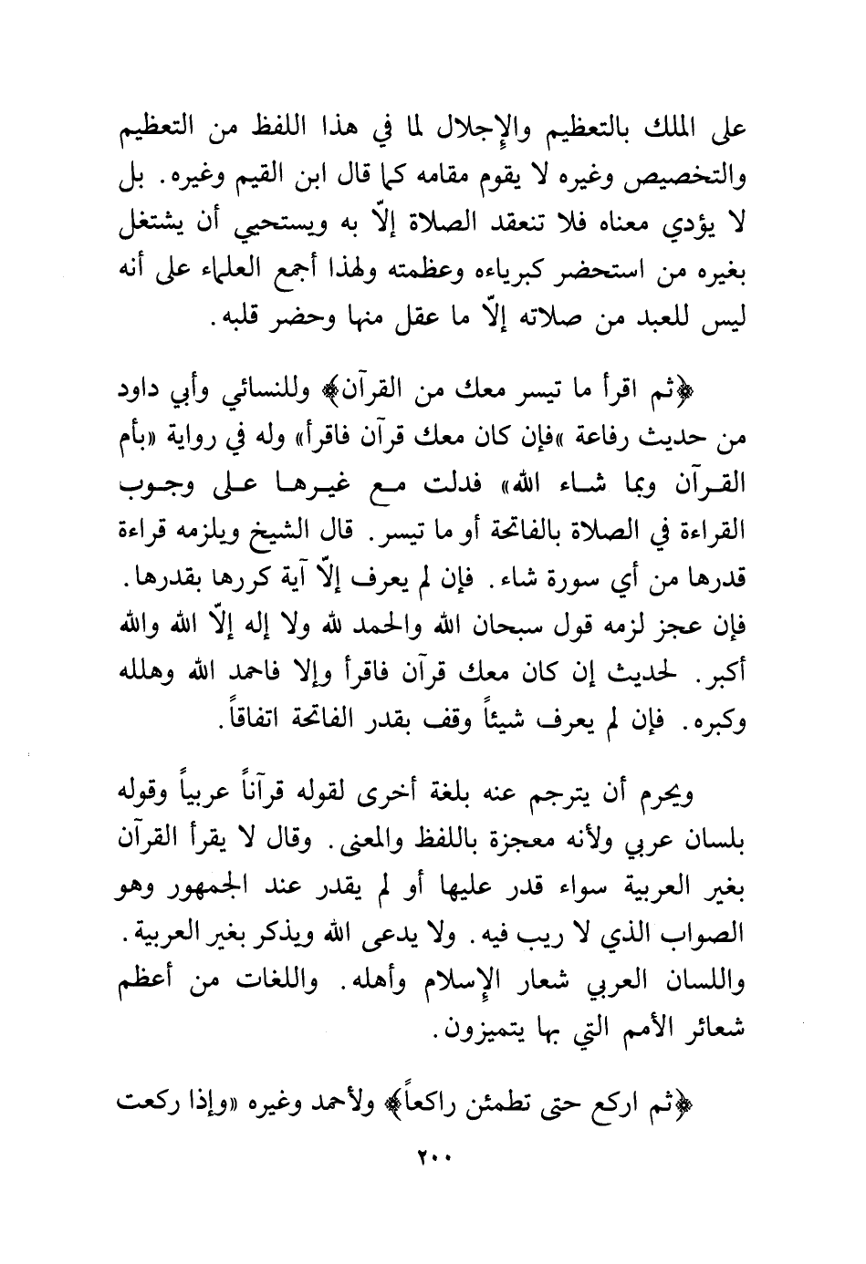 ويحرم أن يترجم عنه بلغة أخرى لقوله قرآنًا عربيًا وقوله بلسان عربي ولأنه معجزة باللفظ والمعنى. وقال لا يقرأ القرآن بغير العربية سواء قدر عليها أو لم يقدر عند الجمهور وهو الصواب الذي لا ريب فيه. ولا يدعى الله ويذكر بغير العربية. واللسان العربي شعار الإسلام وأهله. واللغات من أعظم شعائر الأمم التي بها يتميزون.