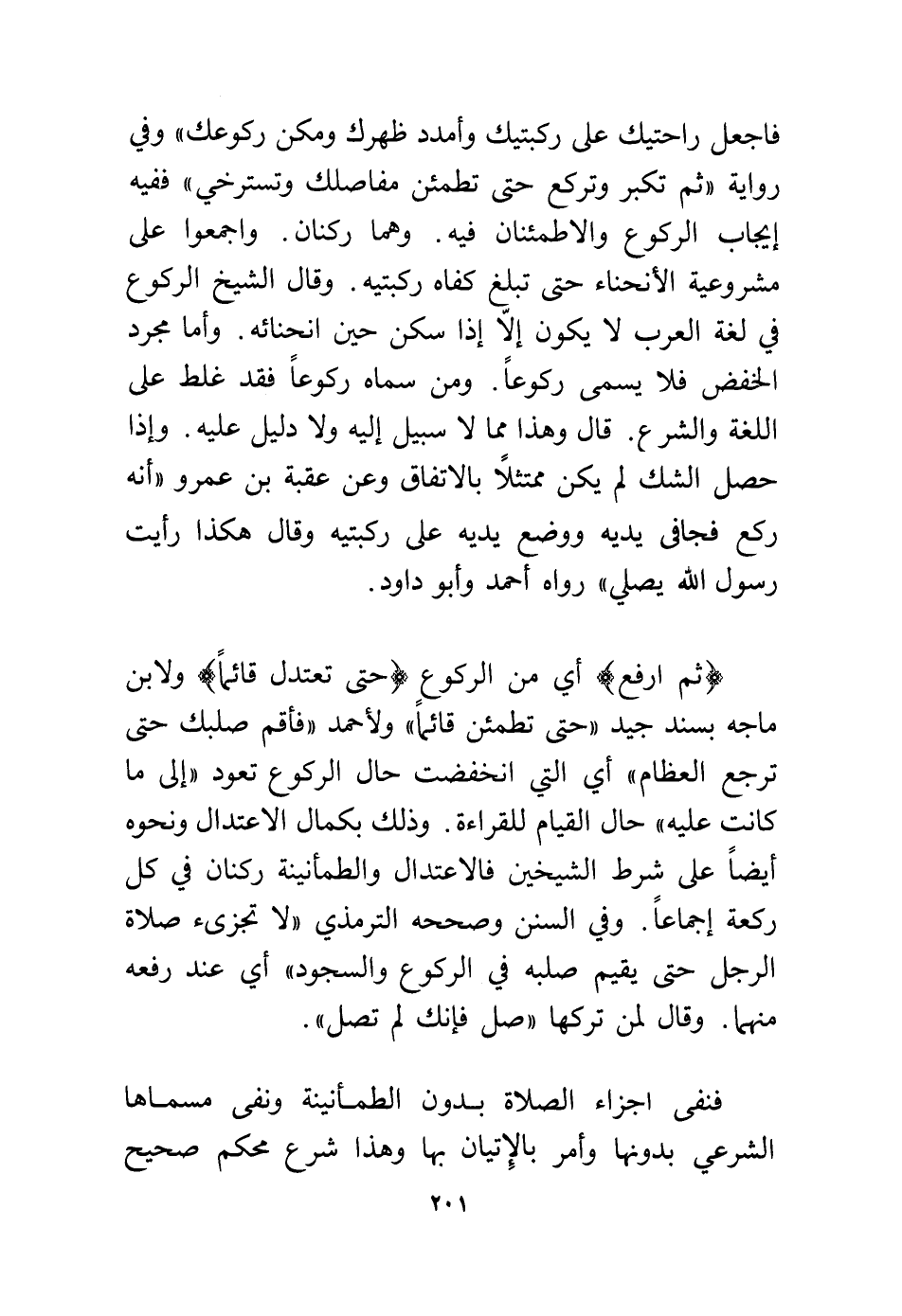فنفى أجزاء الصلاة بدون الطمأنينة ونفى مسماها الشرعي بدونها وأمر بالإتيان بها وهذا شرع محكم صحيح