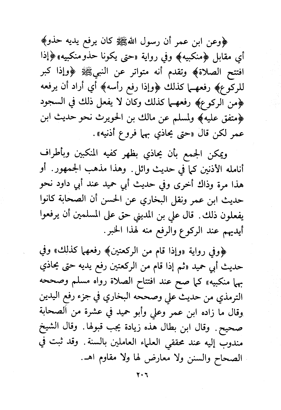 (وعن ابن عمر أن رسول الله – - صلى الله عليه وسلم - كان يرفع يديه حذو) أي مقابل (منكبيه) وفي رواية "حتى يكونا حذو منكبيه" (إذا افتتح الصلاة) وتقدم أنه متواتر عن النبي – - صلى الله عليه وسلم - (وإذا كبر للركوع) رفعهما كذلك (وإذا رفع رأسه) أي اراد أن يرفعه (من الركوع) رفعهما كذلك وكان لا يفعل ذلك في السجود (متفق عليه) ولمسلم عن مالك بن الحويرث نحو حديث ابن عمر لكن قال "حتى يحاذي بهما فروع أذنيه".