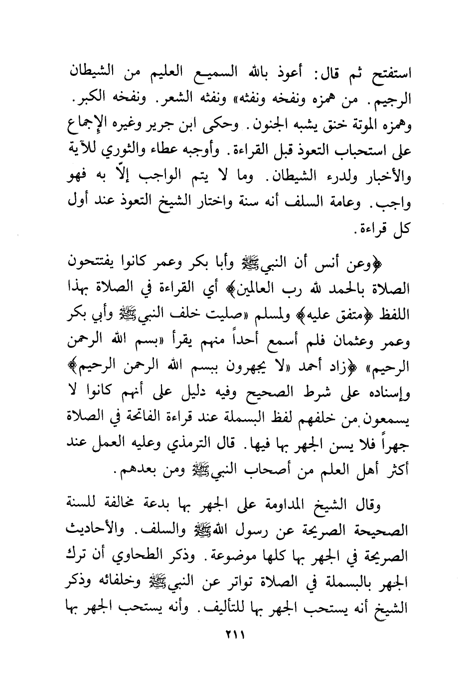 وقال الشيخ المداومة على الجهر بها بدعة مخالفة للسنة الصحيحة الصريحة عن رسول الله – - صلى الله عليه وسلم - والسلف. والأحاديث الصريحة في الجهر بها كلها موضوعة. وذكر الطحاوي أن ترك الجهر بالبسملة في الصلاة تواتر عن النبي – - صلى الله عليه وسلم - وخلفائه وذكر الشيخ أنه يستحب الجهر بها للتأليف. وأنه يستحب الجهر بها