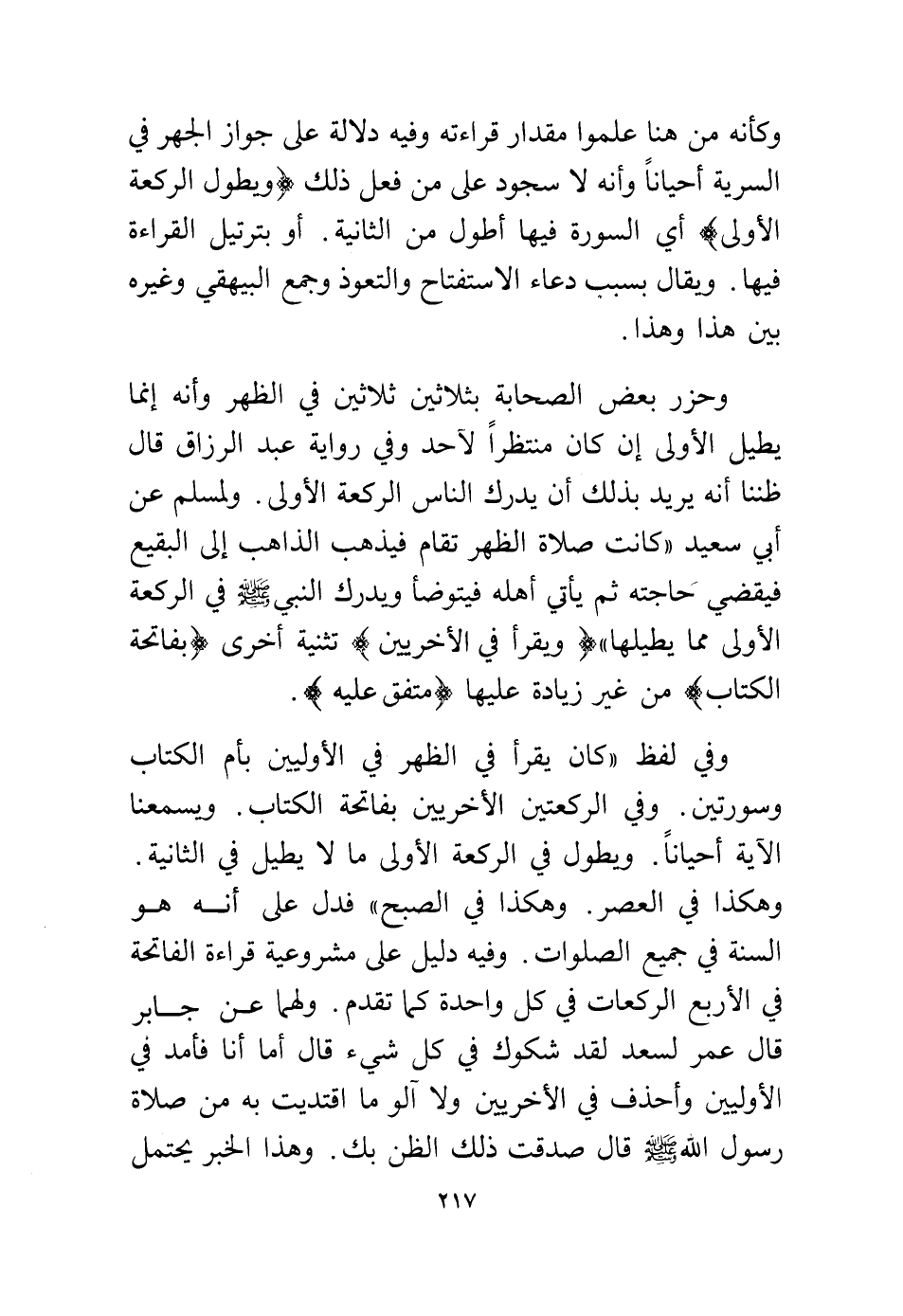 وفي لفظ "كان يقرأ في الظهر في الأوليين بأم الكتاب وسورتين في الركعتين الأخريين بفاتحة الكتاب ويسمعنا الآية أحيانًا ويطول، وفي الركعة الأولى ما لا يطيل في الثانية. وهكذا في العصر. وهكذا في الصبح" فدل على أنه هو السنة في جميع الصلوات. وفيه دليل على مشروعية قراءة الفاتحة في الأربع الركعات في كل واحدة كما تقدم. ولهما عن جابر قال عمر لسعد لقد شكوك في كل شيء قال أما أنا فأمد في الأوليين وأحذف في الأخريين ولا آلو ما اقتديت به من صلاة رسول الله – - صلى الله عليه وسلم - قال صدقت ذلك الظن بك. وهذا الخبر يحتمل