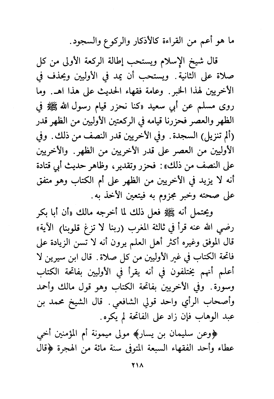 ويحتمل أنه – - صلى الله عليه وسلم - فعل ذلك لما أخرجه مالك "أن أبا بكر رضي الله عنه قرأ في ثالثة المغرب {رَبَّنَا لاَ تُزِغْ قُلُوبَنَا} الآية" قال الموفق وغيره أكثر أهل العلم يرون أنه لا تسن الزيادة على فاتحة الكتاب في غير الأوليين من كل صلاة. قال ابن سيرين لا أعلم أنهم يختلفون في أنه يقرأ في الأوليين بفاتحة الكتاب وسورة. وفي الأخريين بفاتحة الكتاب وهو قول مالك وأحمد وأصحاب الرأي واحد قولي الشافعي. قال الشيخ محمد بن عبد الوهاب فإن زاد على الفاتحة لم يكره.