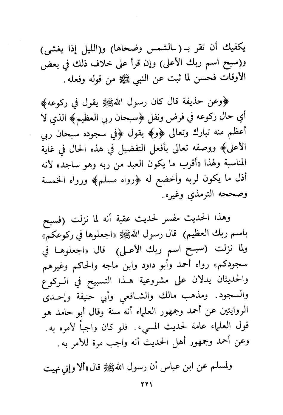وهذا الحديث مفسر لحديث عقبة أنه لما نزلت (فسبح باسم ربك العظيم) قال رسول الله – - صلى الله عليه وسلم - "اجعلوها في ركوعكم" ولما نزلت (سبح اسم ربك الأعلى) قال "اجعلوها في سجودكم" رواه أحمد وأبو داود وابن ماجه والحاكم وغيرهم والحديثان يدلان على مشروعية هذا التسبيح في الركوع والسجود. ومذهب مالك والشافعي وأبي حنيفة وإحدى الروايتين عن أحمد وجمهور العلماء أنه سنة وقال أبو حامد هو قول العلماء عامة لحديث المسيء. فلو كان واجبًا لأمره به.