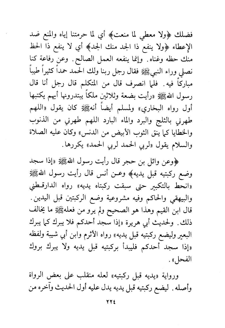 (وعن وائل بن حجر قال رأيت رسول الله – - صلى الله عليه وسلم - "إذا سجد وضع ركبتيه قبل يديه) وعن أنس قال رأيت رسول الله – - صلى الله عليه وسلم - "انحط بالتكبير حتى سبقت ركبتاه يديه" رواه الدارقطني والبيهقي والحاكم وفيه مشروعية وضع الركبتين قبل اليدين.