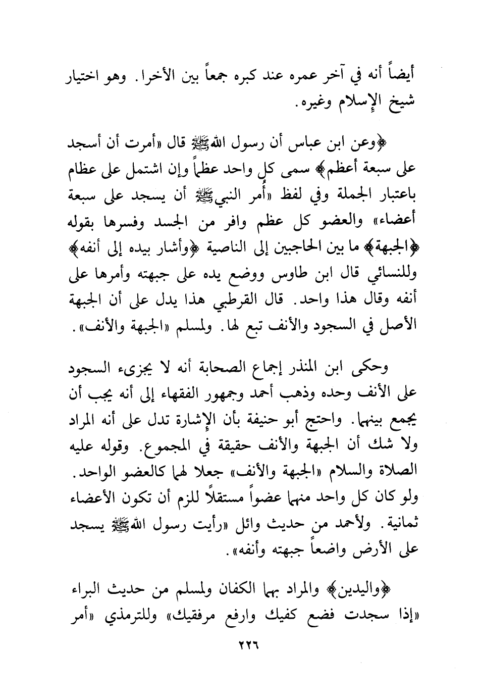 (وعن ابن عباس أن رسول الله – - صلى الله عليه وسلم - قال "أمرت أن أسجد على سبعة أعظم) سمى كل واحد عظمًا وإن اشتمل على عظام باعتبار الجملة وفي لفظ "أمر النبي – - صلى الله عليه وسلم - أن يسجد على سبعة أعضاء" والعضو كل عظم وافر من الجسد وفسرها بقوله (الجبهة) ما بين الحاجبين إلى الناصية (وأشار بيده إلى أنفه) وللنسائي قال ابن طاوس ووضع يده على جبهته وأمرها على أنفه وقال هذا واحد. قال القرطبي هذا يدل على أن الجبهة الأصل في السجود والأنف تبع لها. ولمسلم "الجبهة والأنف".