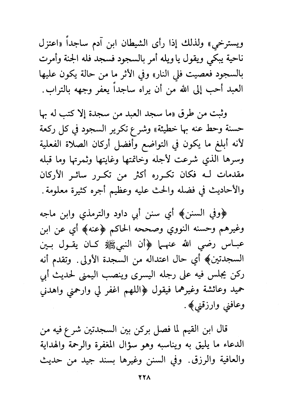 قال ابن القيم لما فصل بركن بين السجدتين شرع فيه من الدعاء ما يليق به ويناسبه وهو سؤال المغفرة والرحمة والهداية والعافية والرزق. وفي السنن وغيرها بسند جيد من حديث