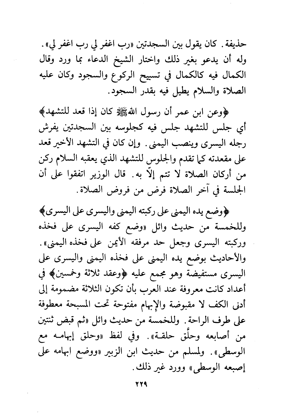 والأحاديث بوضع يده اليمنى على فخذه اليمنى واليسرى على اليسرى مستفيضة وهو مجمع عليه (وعقد ثلاثة وخمسين) في أعداد كانت معروفة عند العرب بأن تكون الثلاثة مضمومة إلى أدنى الكف لا مقبوضة والإبهام مفتوحة تحت المسبحة معطوفة على طرف الراحة. وللخمسة من حديث وائل "ثم قبض ثنتين من أصابعه وحلق حلقة". وفي لفظ "وحلق إبهامه مع الوسطى". ولمسلم من حديث ابن الزبير "ووضع إبهامه على إصبعه الوسطى" وورد غير ذلك.