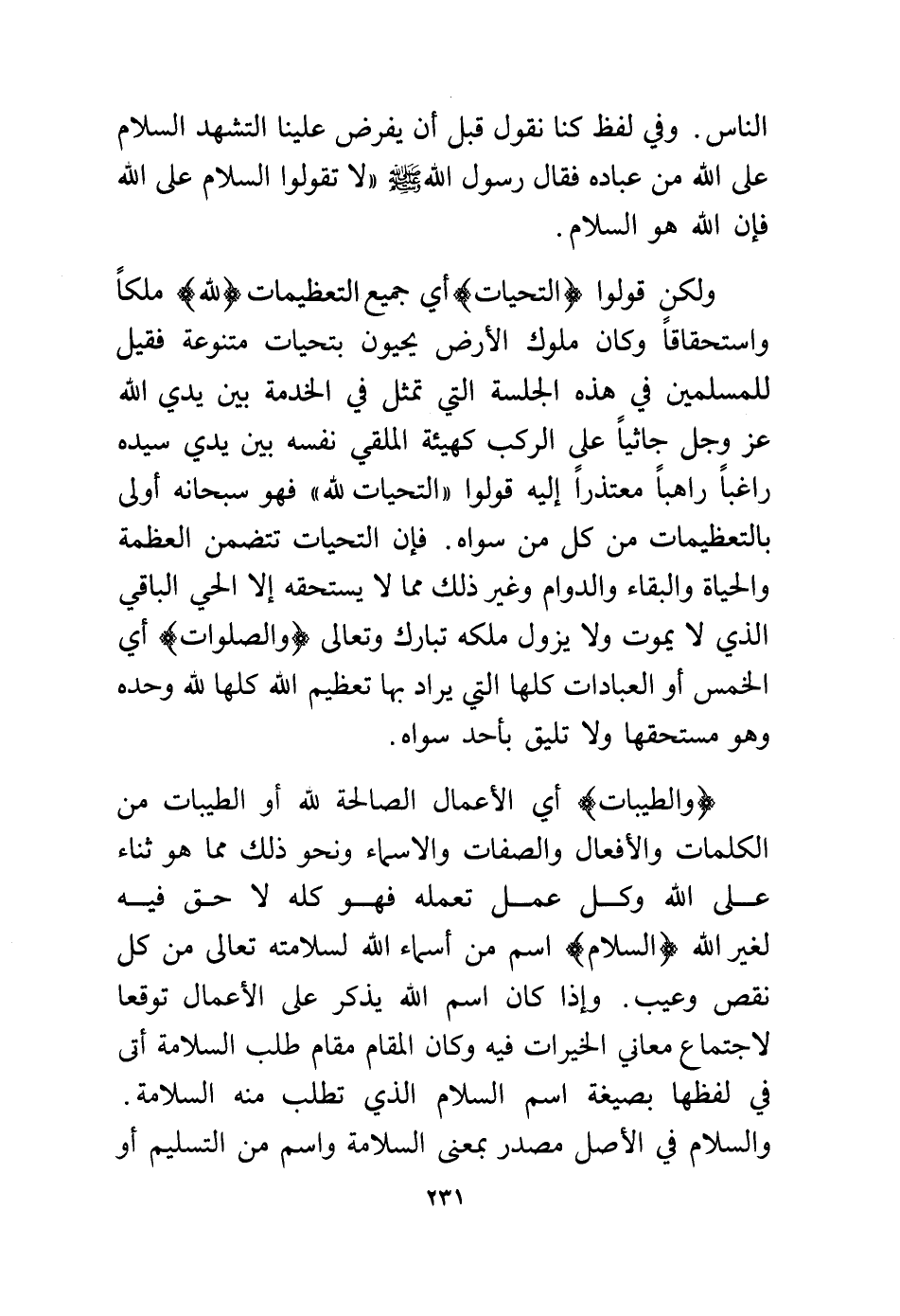ولكن قولوا (التحيات) أي جميع التعظيمات (لله) ملكًا واستحقاقًا وكان ملوك الأرض يحيون بتحيات متنوعة فقيل للمسلمين في هذه الجلسة التي تمثل في الخدمة بين يدي الله عز وجل جاثيًا على الركب كهيئة الملقي نفسه بين يدي سيده راغبًا وراهبًا معتذرًا إليه قولوا "التحيات لله" فهو سبحانه أولى بالتعظيمات من كل من سواه، فإن التحيات تتضمن العظمة والحياة والبقاء والدوام وغير ذلك مما لا يستحقه إلا الحي الباقي الذي لا يموت ولا يزول ملكه تبارك وتعالى (والصلوات) أي الخمس أو العبادات كلها التي يراد بها تعظيم الله كلها لله وحده وهو مستحقها ولا تليق بأحد سواه.