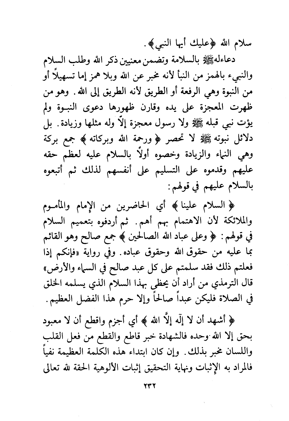 دعاء له – - صلى الله عليه وسلم - بالسلامة وتضمن معنيين ذكر الله وطلب السلام والنبيء بالهمز من النبأ لأنه مخبر عن الله وبلا همز إما تسهيلاً أو من النبوة وهي الرفعة أو الطريق لأنه الطريق إلى الله، وهو من ظهرت المعجزة على يده وقارن ظهورها دعوى النبوة ولم يؤت نبي قبله – - صلى الله عليه وسلم - ولا رسول معجزة إلا وله مثلها وزيادة. بل دلائل نبوته – - صلى الله عليه وسلم - لا تحصر (ورحمة الله وبركاته) جمع بركة وهي النماء والزيادة وخصوه أولاً بالسلام عليه لعظم حقه عليهم وقدموه على التسليم على أنفسهم لذلك ثم أتبعوه بالسلام عليهم في قولهم: