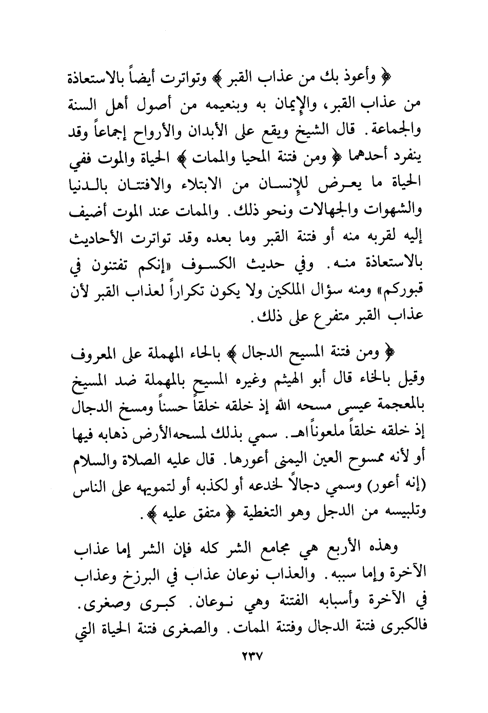 وهذه الأربع هي مجامع الشر كله فإن الشر إما عذاب الآخرة وإما سببه. والعذاب نوعان عذاب في البرزخ وعذاب في الآخرة وأسبابه الفتنة وهي نوعان. كبرى وصغرى.