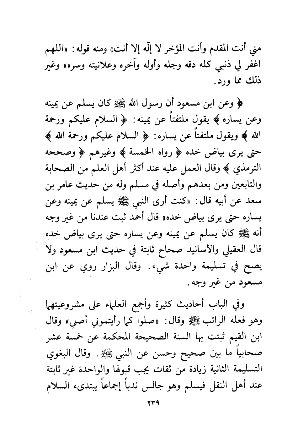 وفي الباب أحاديث كثيرة وأجمع العلماء على مشروعيتهما وهو فعله الراتب – - صلى الله عليه وسلم - وقال: "صلوا كما رأيتموني أصلي" وقال ابن القيم ثبتت بها السنة الصحيحة المحكمة عن خمسة عشر صحابيًا ما بين صحيح وحسن عن النبي – - صلى الله عليه وسلم - وقال البغوي التسليمة الثانية زيادة من ثقات يجب قبولها والواحدة غير ثابتة عند أهل النقل فيسلم وهو جالس ندبًا إجماعًا يبتدئ السلام