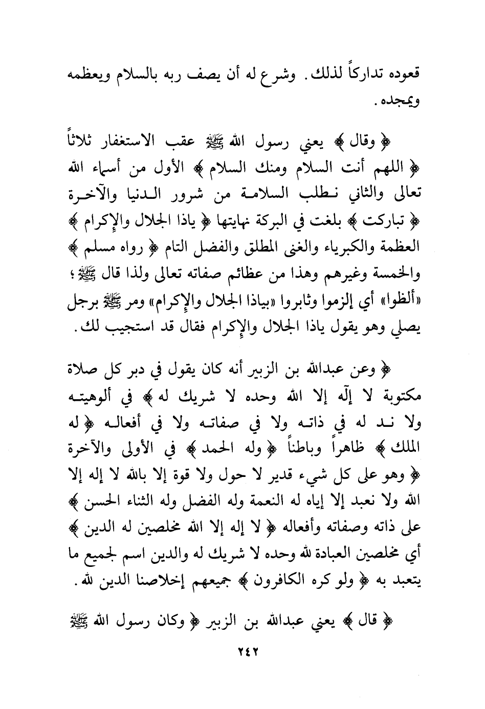 (وقال) يعني رسول الله – - صلى الله عليه وسلم - عقب الاستغفار ثلاثًا (اللهم أنت السلام ومنك السلام) الأول من أسماء الله تعالى والثاني نطلب السلامة من شرور الدنيا والآخرة (تباركت) بلغت في البركة نهايتها (يا ذا الجلال والإكرام العظمة والكبرياء والغنى المطلق والفضل التام (رواه مسلم والخمسة وغيرهم وهذا من عظائم صفاته تعالى، ولذا قال – - صلى الله عليه وسلم - "ألظوا" أي إلزموا وثابروا "بياذا الجلال والإكرام" ومر – - صلى الله عليه وسلم - برجل يصلي وهو يقول يا ذا الجلال والإكرام فقال قد استجيب لك.