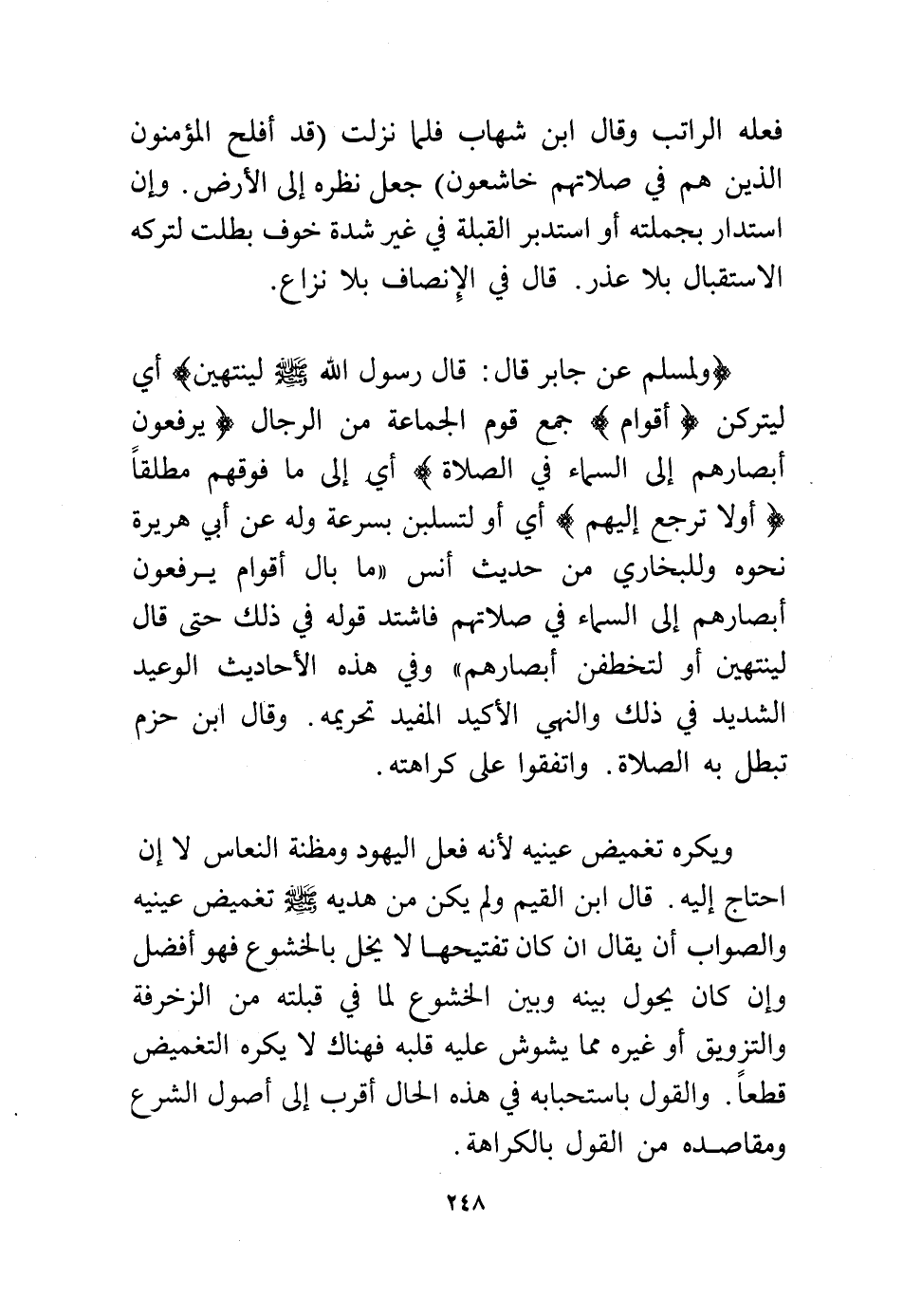 (ولمسلم عن جابر قال: قال رسول الله – - صلى الله عليه وسلم - لينتهين) أي ليتركن (أقوام) جمع قوم الجماعة من الرجال (يرفعون أبصارهم إلى السماء في الصلاة) أي إلى ما فوقهم مطلقًا (أولا ترجع إليهم) أي أو لتسلبن بسرعة وله عن أبي هريرة نحوه وللبخاري من حديث أنس "ما بال أقوام يرفعون أبصارهم إلى السماء في صلاتهم فاشتد قوله في ذلك حتى قال لينتهين أو لتخطفن أبصارهم" وفي هذه الأحاديث الوعيد الشديد في ذلك والنهي الأكيد المفيد تحريمه، وقال ابن حزم تبطل به الصلاة، واتفقوا على كراهته.